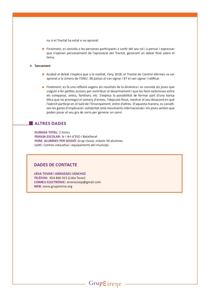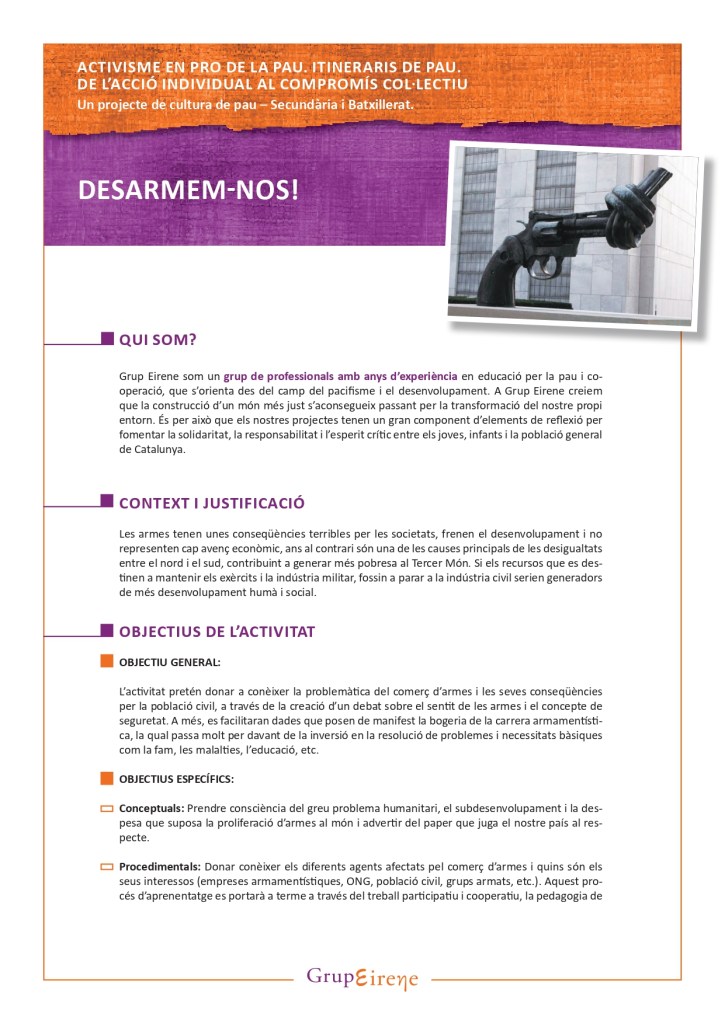 Taller Desarmem-nos! Els conflictes armats, les armes i les conseqüències que provoquen no són només realitats virtuals que apareixen en la nostra quotidianitat a través de les notícies, les pel·lícules, els videojocs, etc, sinó realitats que comporten situacions terribles per la població civil. Les armes i el seu comerç provoquen milers de morts i ferits anualment i aturen el desenvolupament dels països en conflicte. Malgrat això, molts països continuen invertint desmesuradament en armament i continuen venent-se armes a països amb conflicte armat sense establir uns controls que vigilin i discriminin la venda d’armes en els països més vulnerables. El taller que presentem pretén debatre temes com el sentit de les armes, el concepte de seguretat, donar a conèixer dades que posin de manifest la bogeria de la carrera armamentística passant molt per davant de la inversió en la resolució de problemes i necessitats bàsiques com la fam, les malalties, l’educació, etc. Així com introduir la problemàtica del comerç d’armes, i les seves conseqüències per la població civil. El taller es realitzarà amb metodologies participatives i visuals: debat, núvol d’idees, vídeo i joc de rol, que permetrà construir la informació conjuntament entre tots i totes.