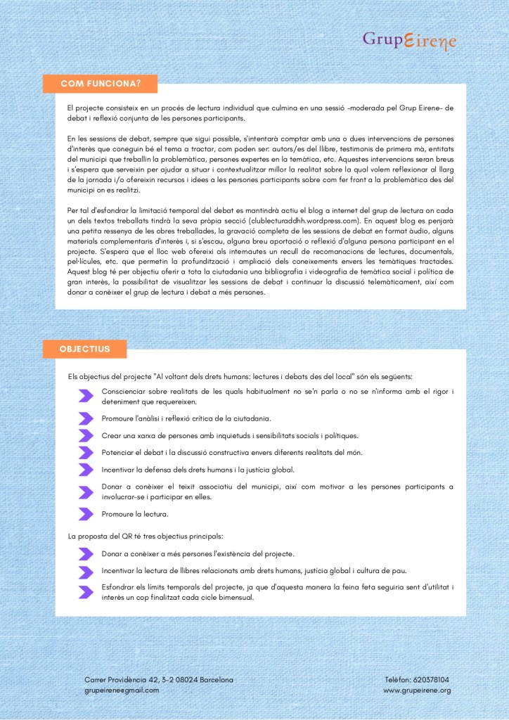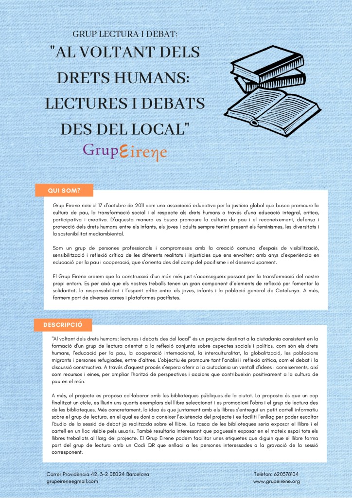 “Al voltant dels drets humans: lectures i debats des del local” és un projecte coordinat per Grup Eirene i que neix, inicialment, amb el suport del Departament de Cooperació i Solidaritat de l’Ajuntament de Santa Coloma de Gramenet. La iniciativa consisteix en la formació d’un grup de lectura orientat a la reflexió conjunta sobre aspectes socials i polítics, com són els drets humans, l’educació per la pau, la cooperació internacional, la interculturalitat, la globalització, les poblacions migrants i persones refugiades, entre d’altres.