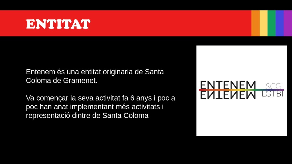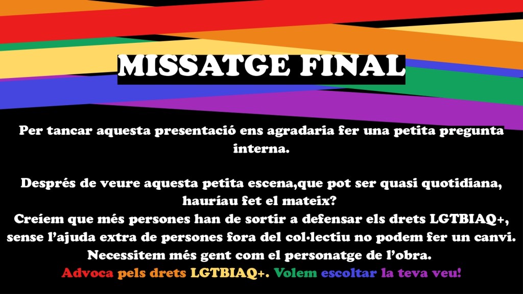 Les joves d’aquest grup van realitzar una entrevista a un membre de l’entitat d’Entenem LGTBI una presentació gràfica on mostren el seu aprofundiment sobre la temàtica i una petita obra de teatre per visibilitzar les discriminacions que reben les persones per la seva orientació sexual o gènere i van defensar el suport cap al col·lectiu.