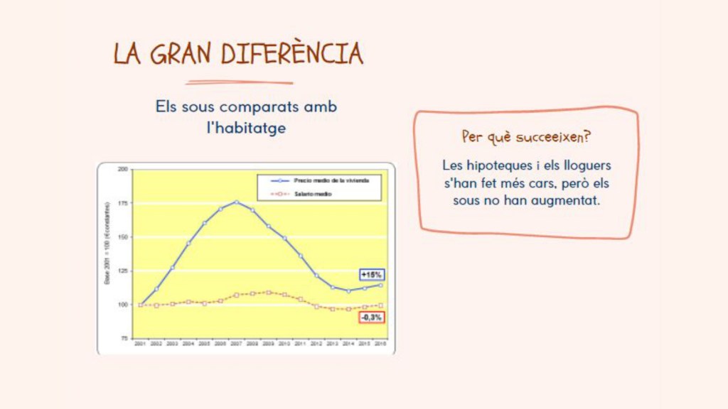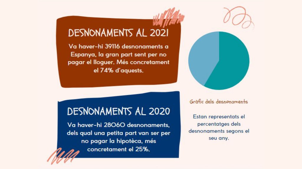 Els joves d’aquest grup van entrevistar a la Plataforma per l’Habitatge de Santa Coloma i juntament amb el vídeo van acompanyar-ho amb una presentació per mostrar la cara oculta dels desnonaments i finalment van fer una performance teatralitzada amb una visió crítica dels actors dels desnonaments.