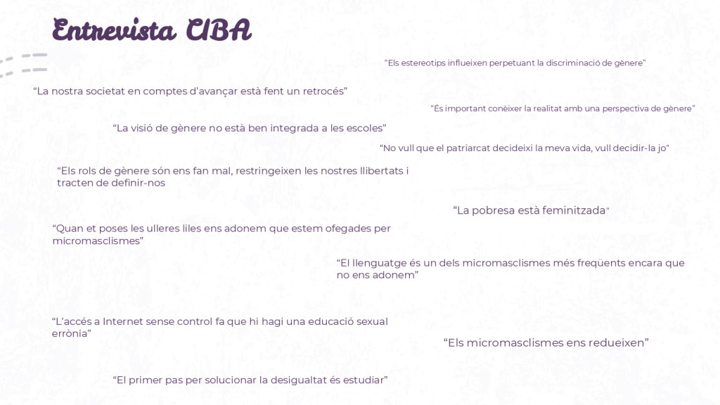 Aquest grup va treballar amb l’entitat Artemis i La Ciba, va entrar a l’escenari ballant una cançó feminista, va realitzar una entrevista, una presentació gràfica, on es va poder veure totes les accions que van fet i els aprenentatges adquirits durant el projecte i finalment van fer una petita obra de teatre per sensibilitzar al públic de les situacions de violència de gènere.