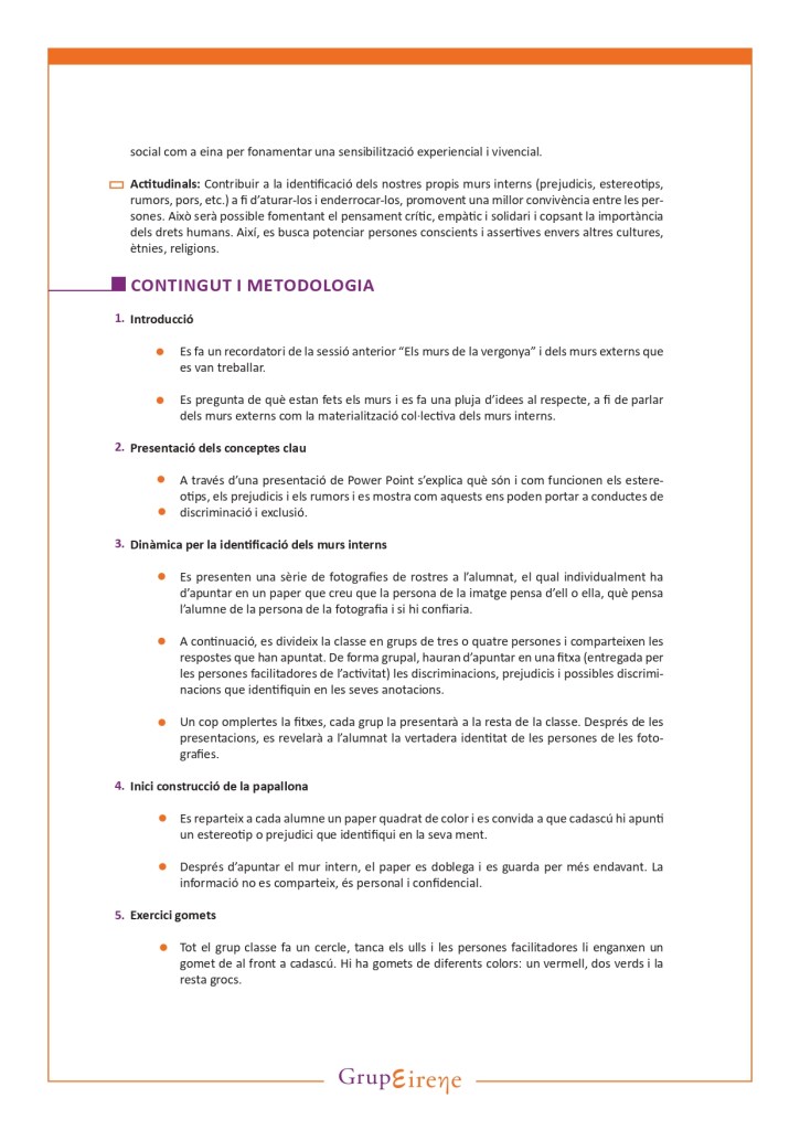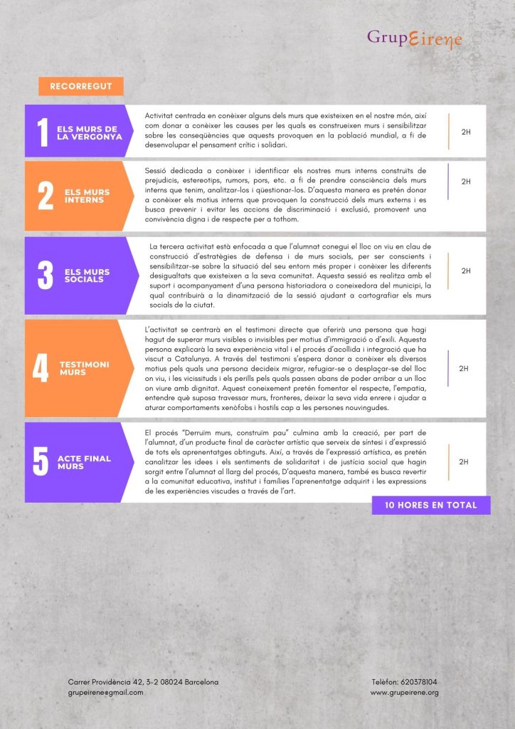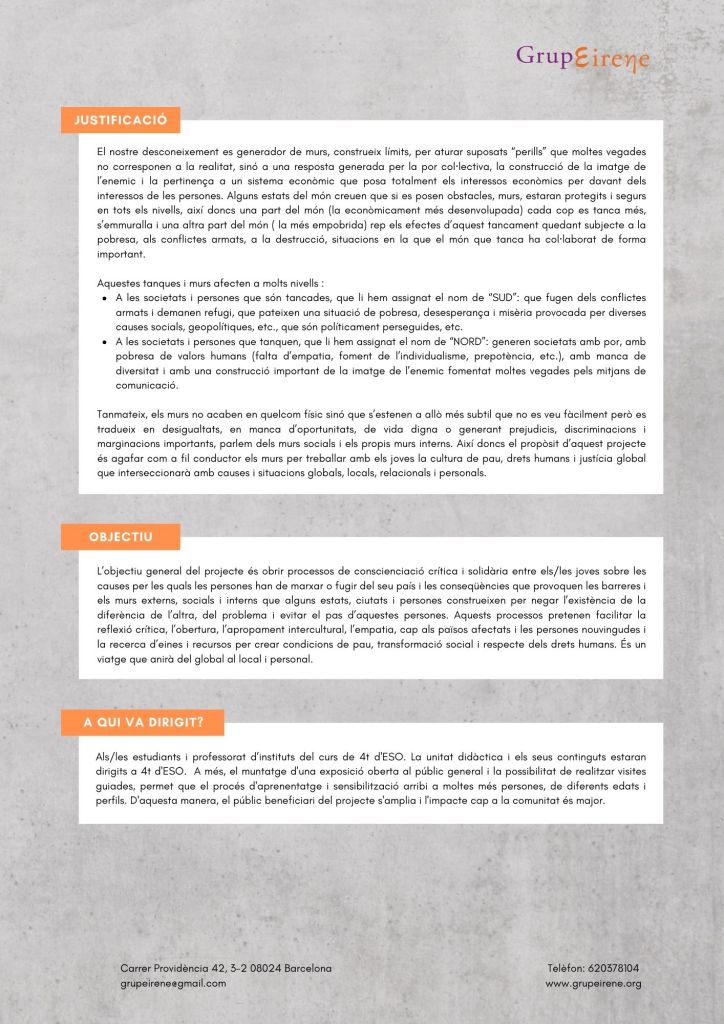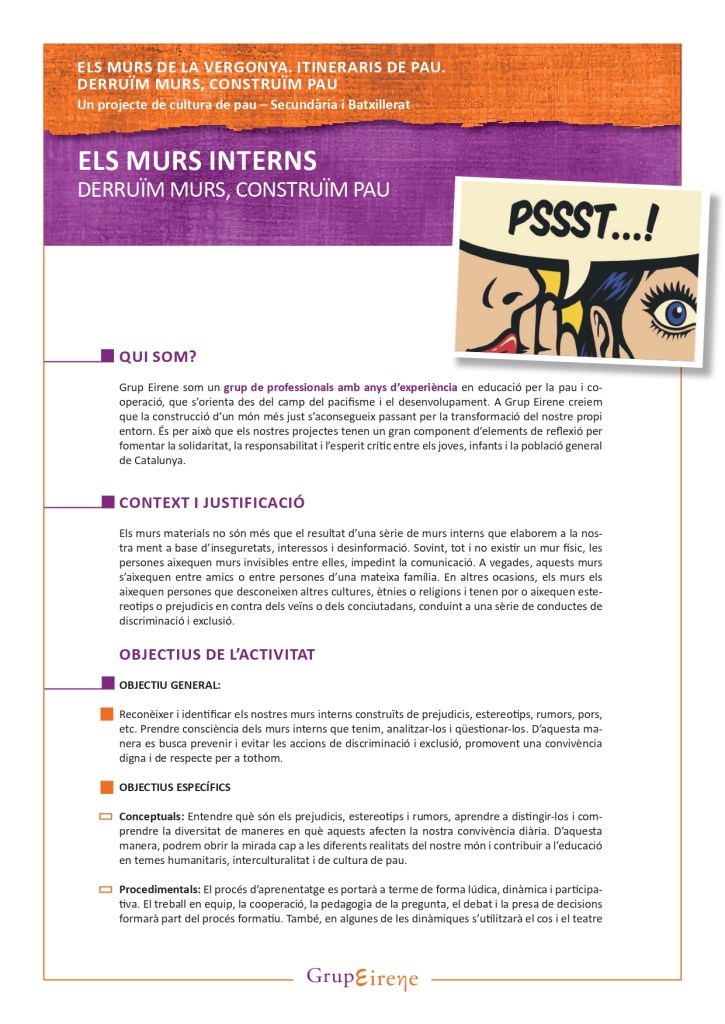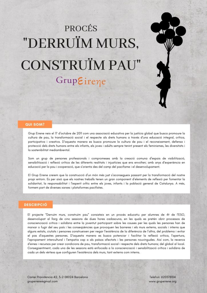 Per aconseguir-ho Grup Eirene treballa amb diferents eines com l’exposició “Els murs de la vergonya” que es proposa com una forma de tractar entre els joves i la població general la cultura de pau, els drets humans i el desenvolupament.