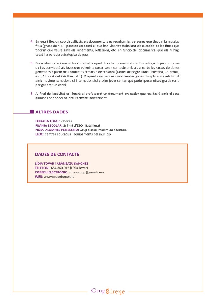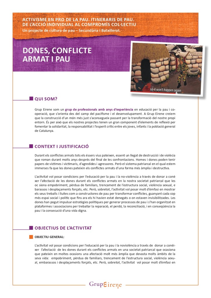 Aquest taller vol apropar als joves el paper dels estereotips i dels valors de gènere en situació de conflicte armat, evidenciant com les desigualtats de gènere en algunes societats contribueixen a infligir abusos físics i psicològics contra les dones, però sobretot vol ser una mostra a l’esperança i al poder de construcció de pau que han edificat les dones a traves de moltes associacions i xarxes que s’han estès a nivell internacional.