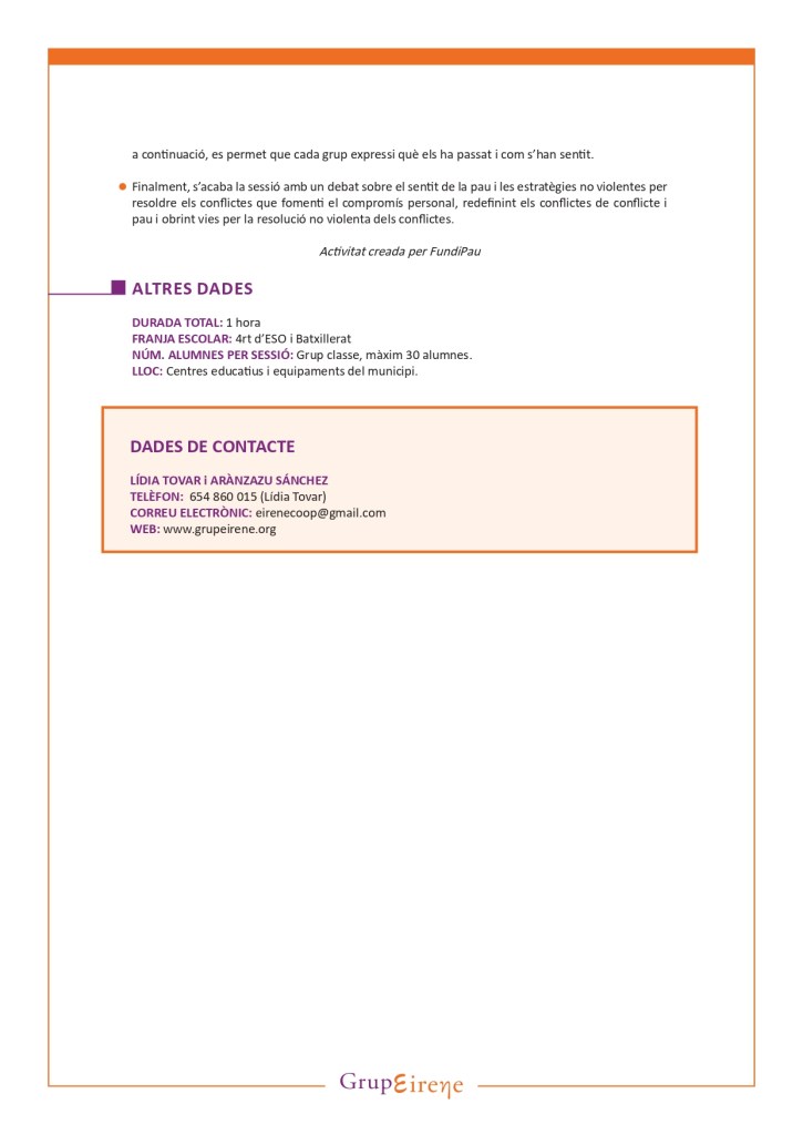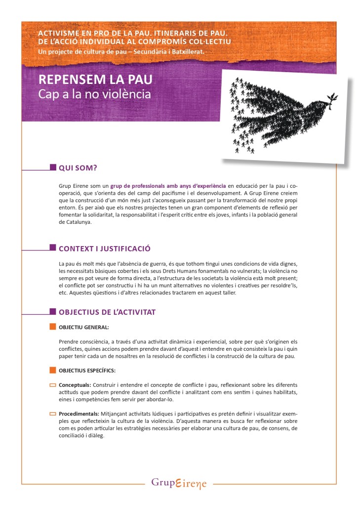 El taller de pau està dirigit a nois i noies que estiguin cursant ESO o Batxillerat. La durada estimada dels tallers pot ser d’una a dues hores, depenent de l’activitat escollida pel centre.