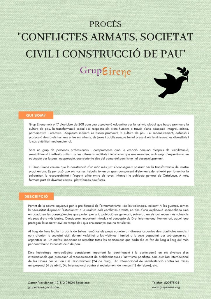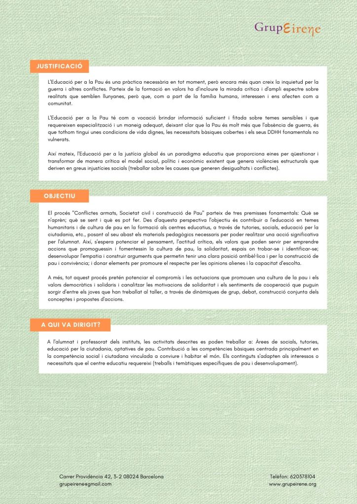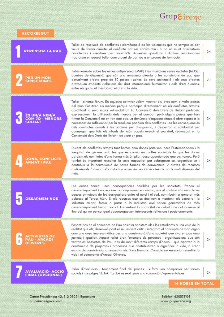 Al llarg de l’any lectiu i a partir de tallers temàtics els grups coneixeran diversos aspectes dels conflictes armats i com afecten la societat civil; donant visibilitat a les víctimes i també a la seva capacitat per sobreposar-se i organitzar-se. Un èmfasi important és ressaltar totes les aportacions que cada dia es fan de llarg a llarg del món per contribuir a la construcció de pau.