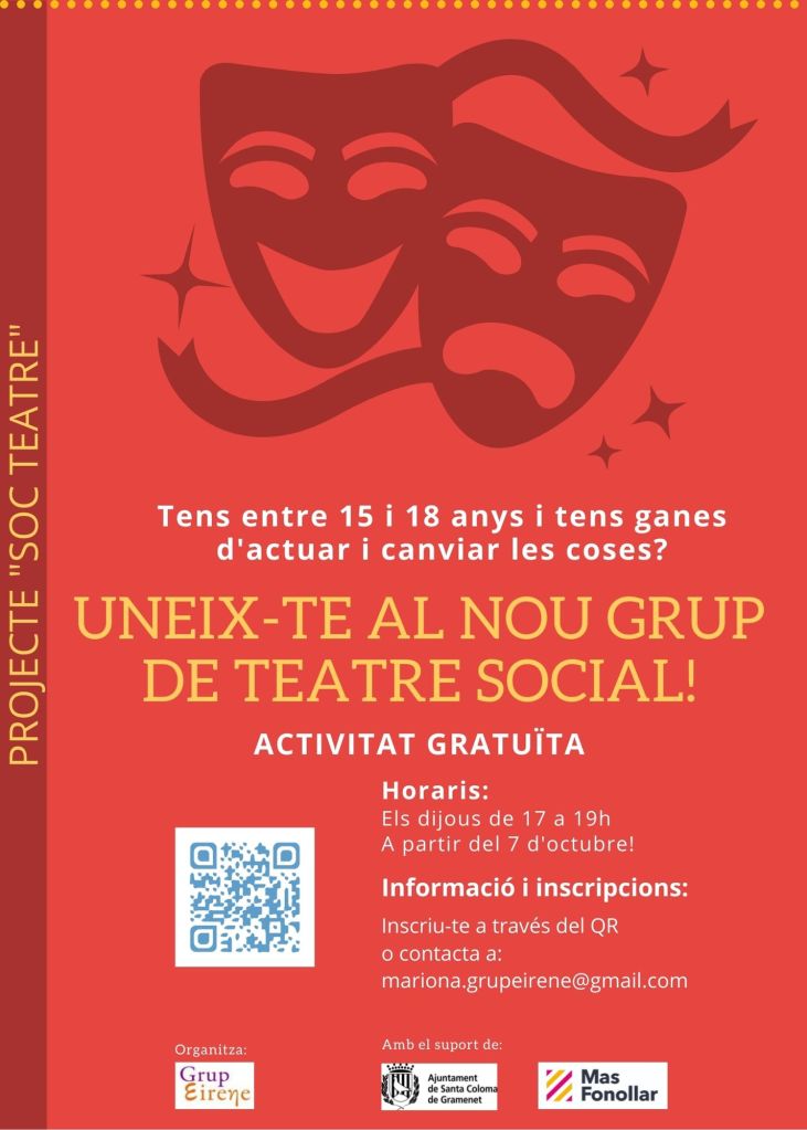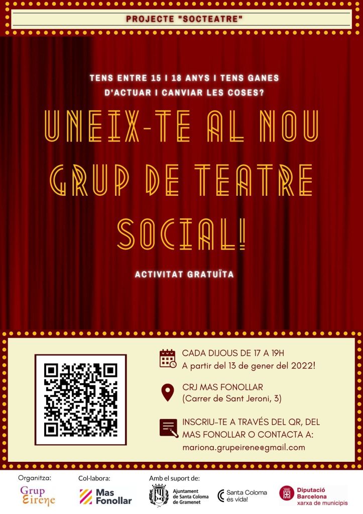“SocTeatre” és un projecte creat i dinamitzat pel Grup Eirene amb el suport del Departament de Solidaritat i Cooperació de l’Ajuntament de Santa Coloma de Gramenet i el CRJ Mas Fonollar. L’activitat està destinada a joves colomencs d’entre 15 i 18 anys i consisteix en la creació d’un grup de teatre social. La proposta buscava l’assoliment de dos objectius interdependents: per una banda, pretenia donar a conèixer l’actuació com una eina d’expressió, autoconeixement, crítica i reflexió i, per l’altra, sensibilitzar i conscienciar de les injustícies del món en el qual vivim des de l’educació per la ciutadania global. S’esperava aconseguir una simbiosi d’ambdós objectius, empoderant als i les joves de Santa Coloma de Gramenet i incentivant la seva implicació i lluita per la transformació social i la defensa dels drets humans i la justícia global.