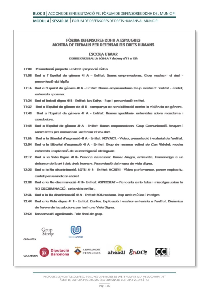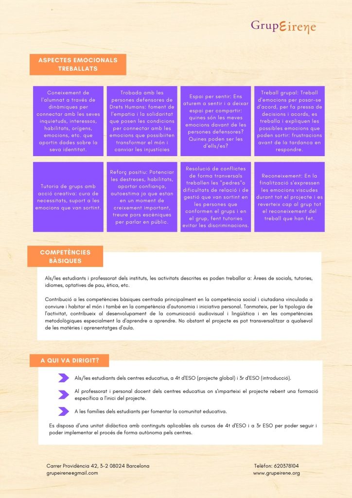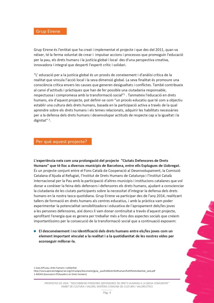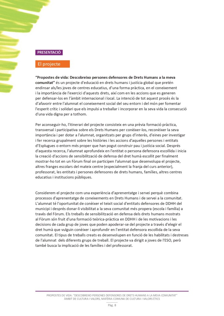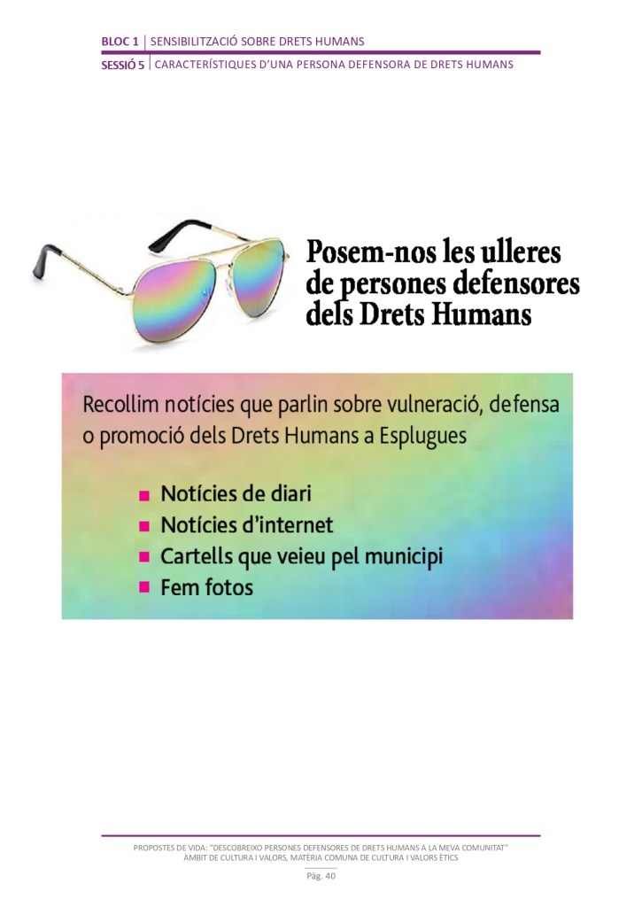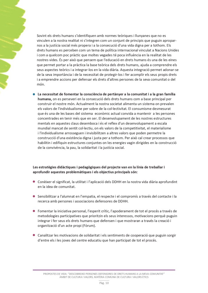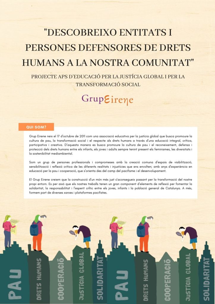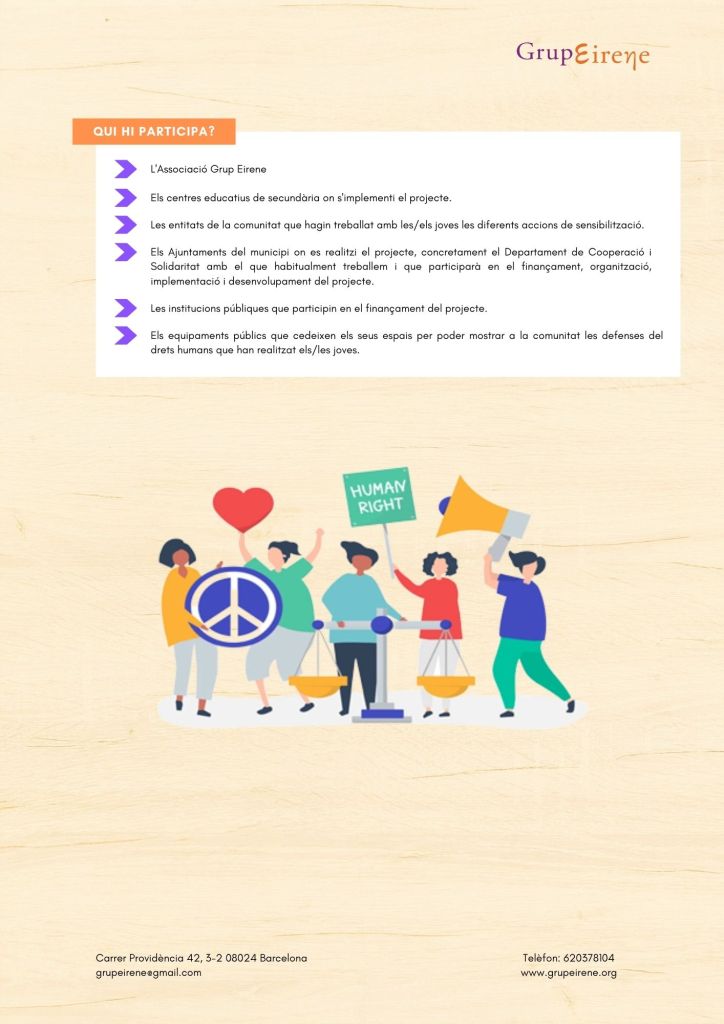 És un projecte d’aprenentatge i servei d’educació en drets humans que pretén endinsar als/les joves, d’una forma pràctica, en el coneixement i la importància de l’exercici d’aquests drets, així com en les accions que es generen per defensar-los en l’àmbit internacional i local. La intenció de tot aquest procés és la d’afavorir entre joves el coneixement social del seu entorn i del món per fomentar l’esperit crític i solidari que els impulsi a treballar i incorporar en la seva vida la consecució d’una vida digna per a tothom.