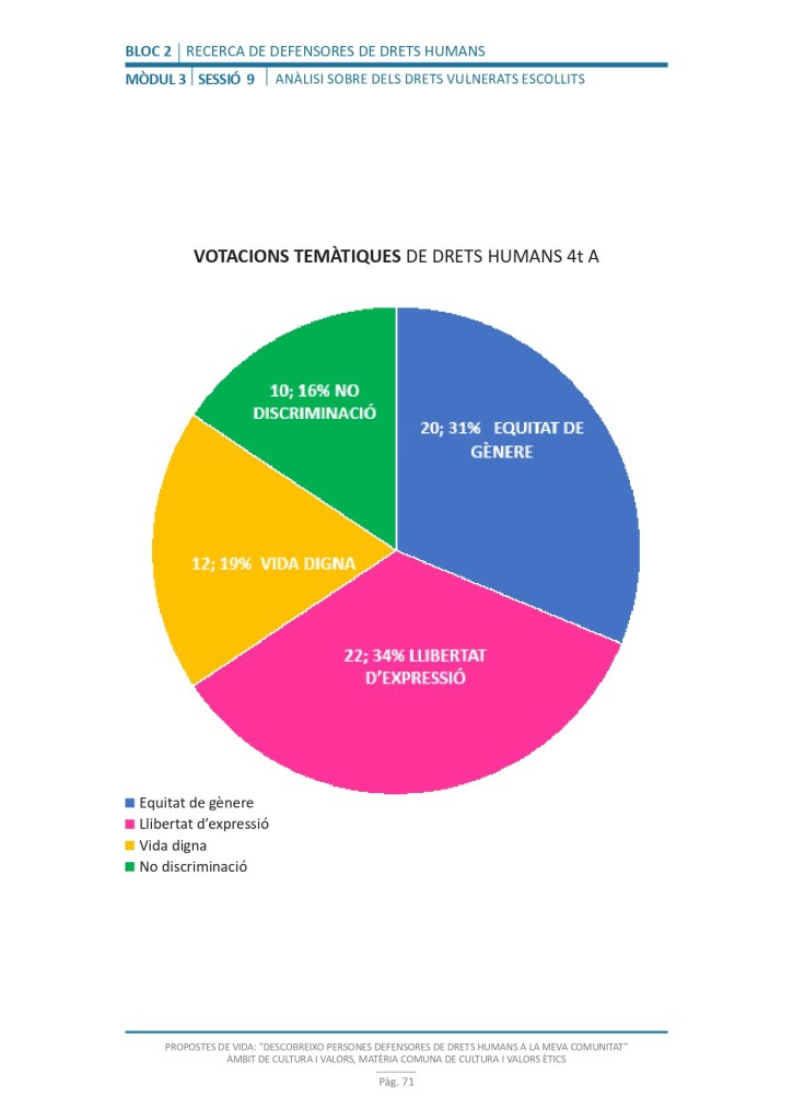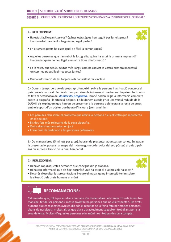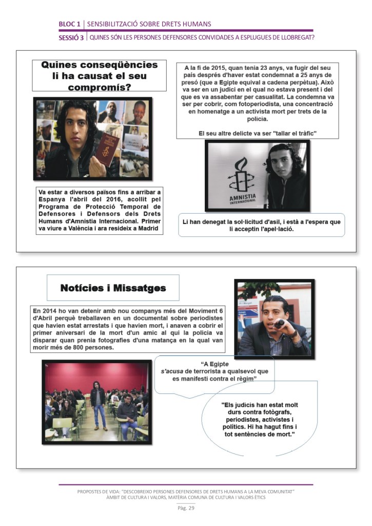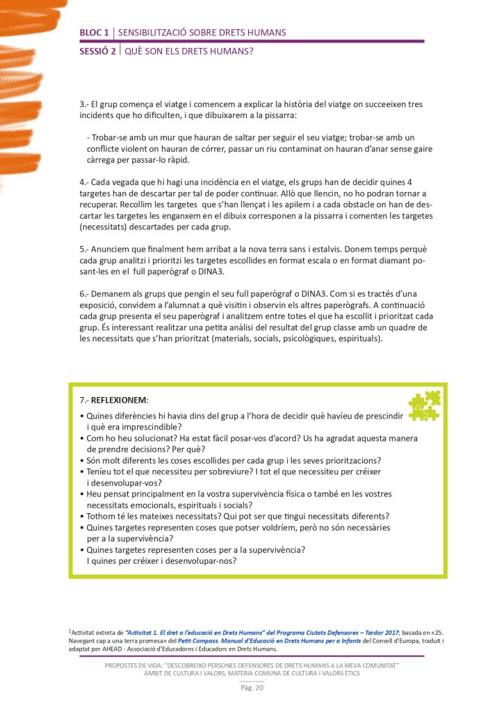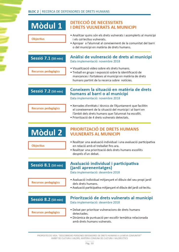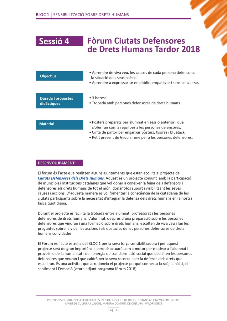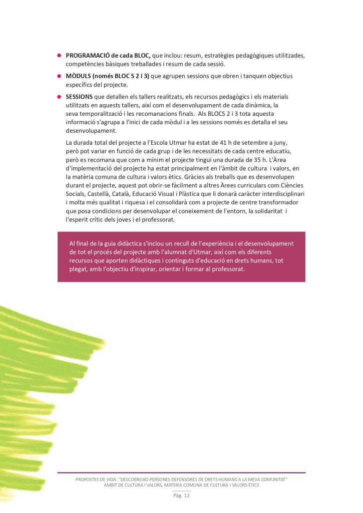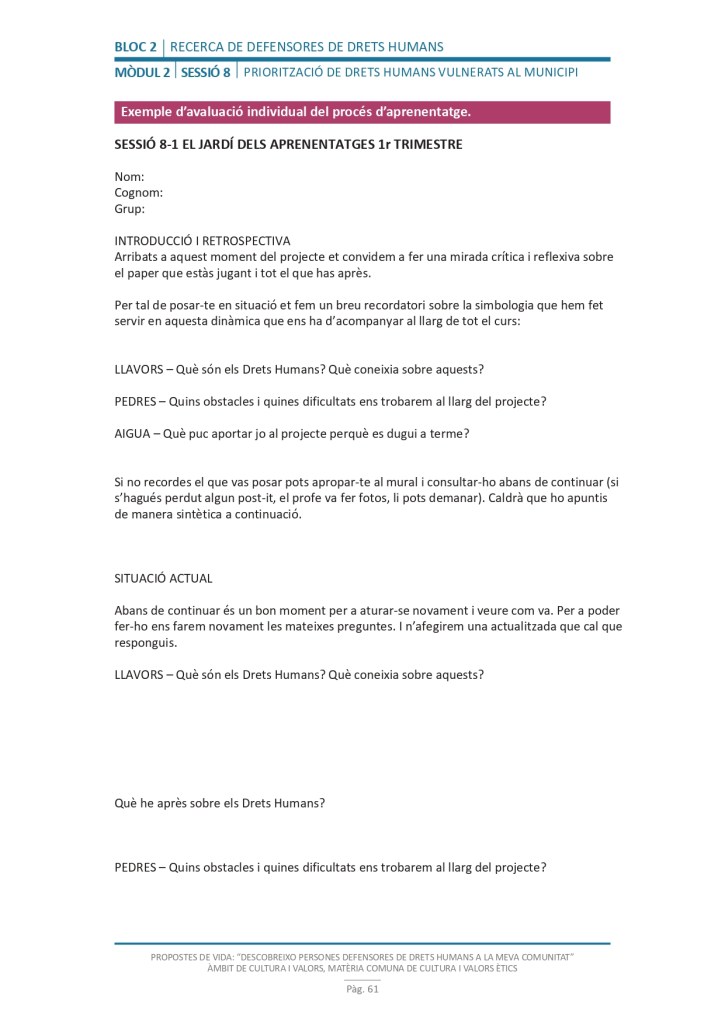 És un projecte d’aprenentatge i servei d’educació en drets humans que pretén endinsar als/les joves, d’una forma pràctica, en el coneixement i la importància de l’exercici d’aquests drets, així com en les accions que es generen per defensar-los en l’àmbit internacional i local. La intenció de tot aquest procés és la d’afavorir entre joves el coneixement social del seu entorn i del món per fomentar l’esperit crític i solidari que els impulsi a treballar i incorporar en la seva vida la consecució d’una vida digna per a tothom.