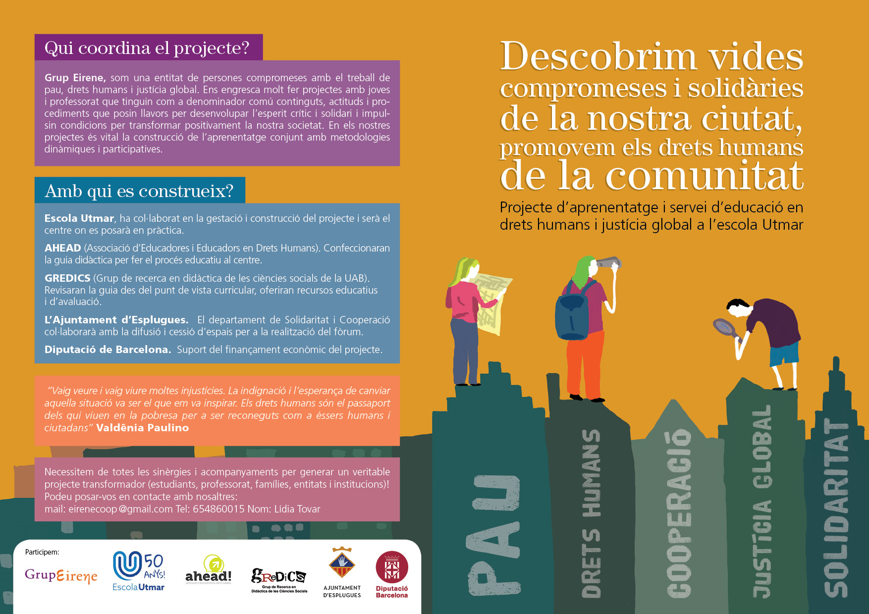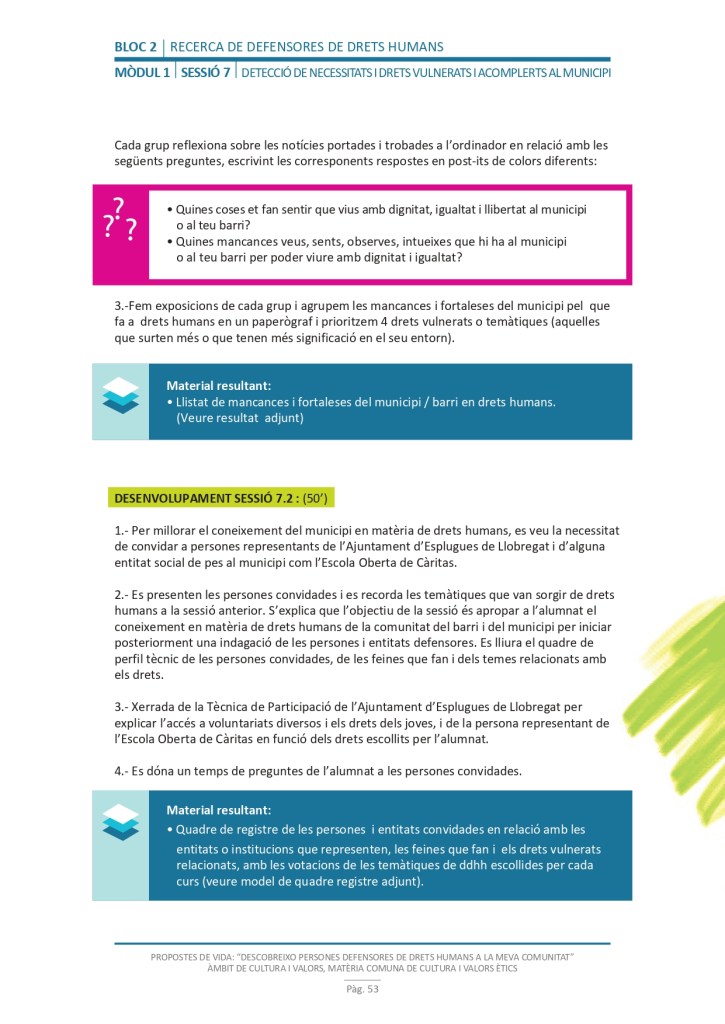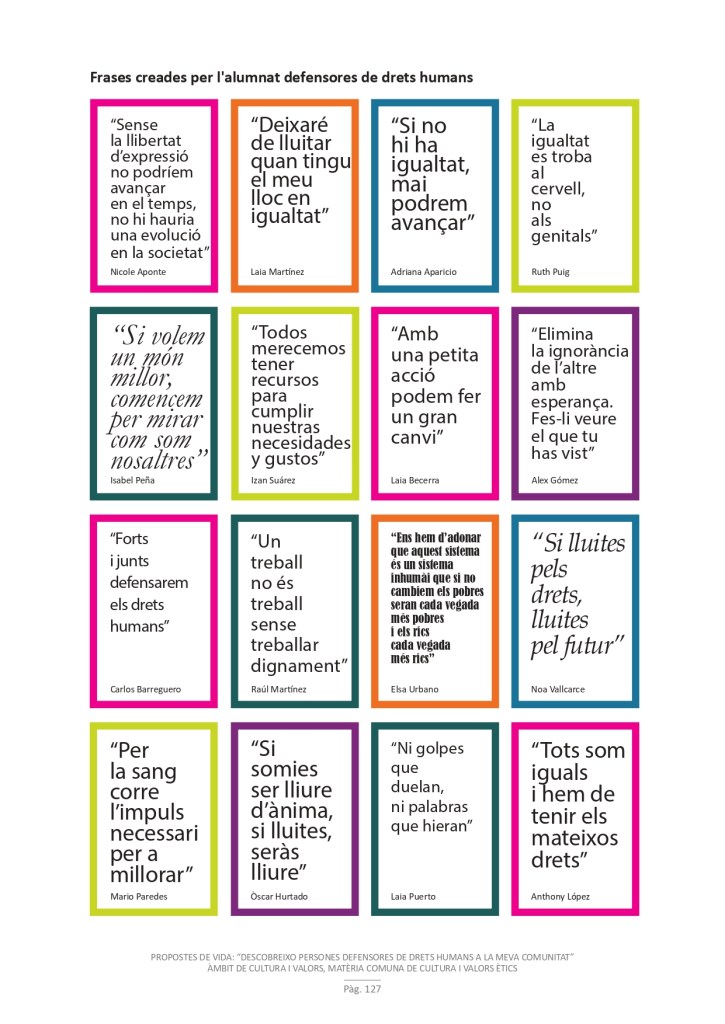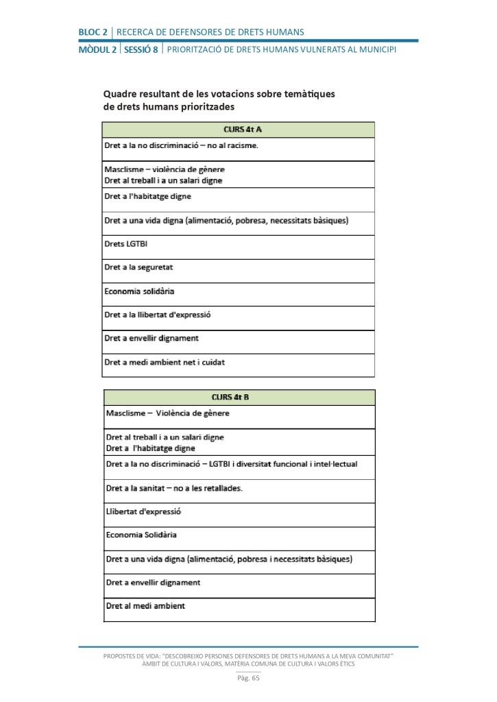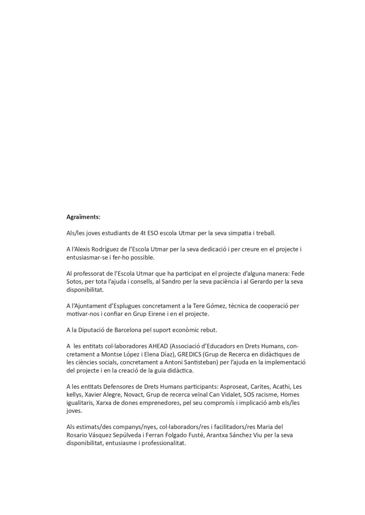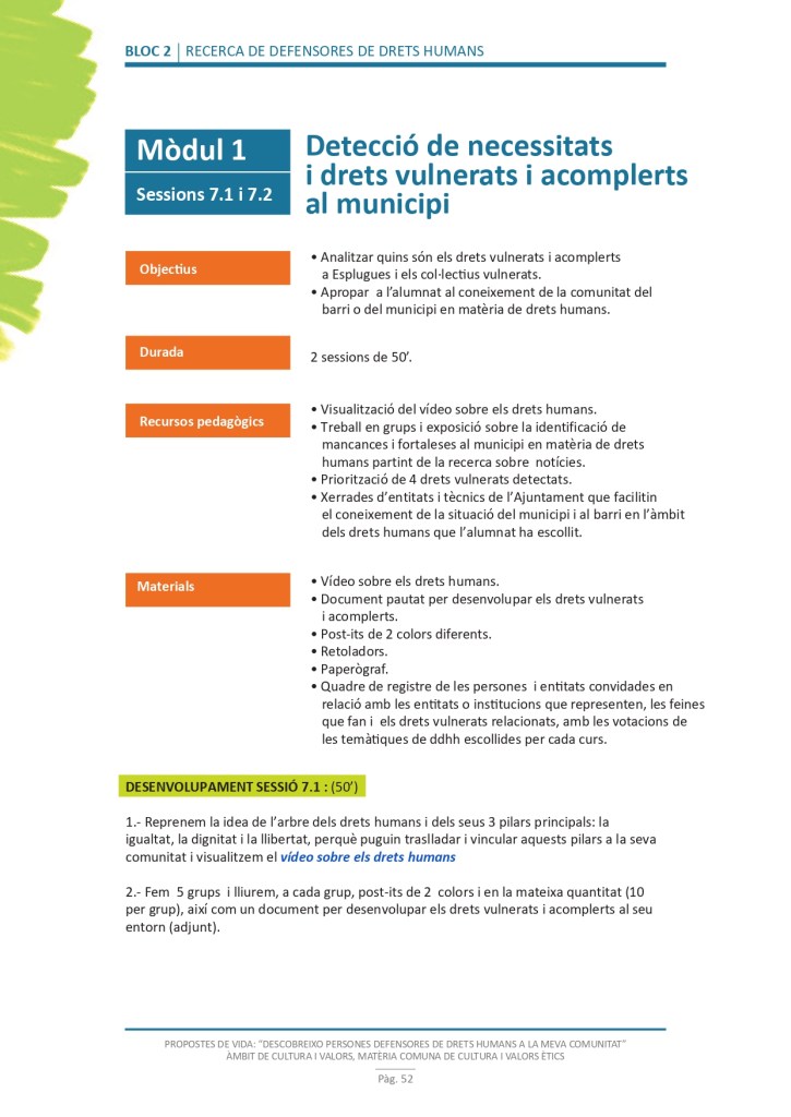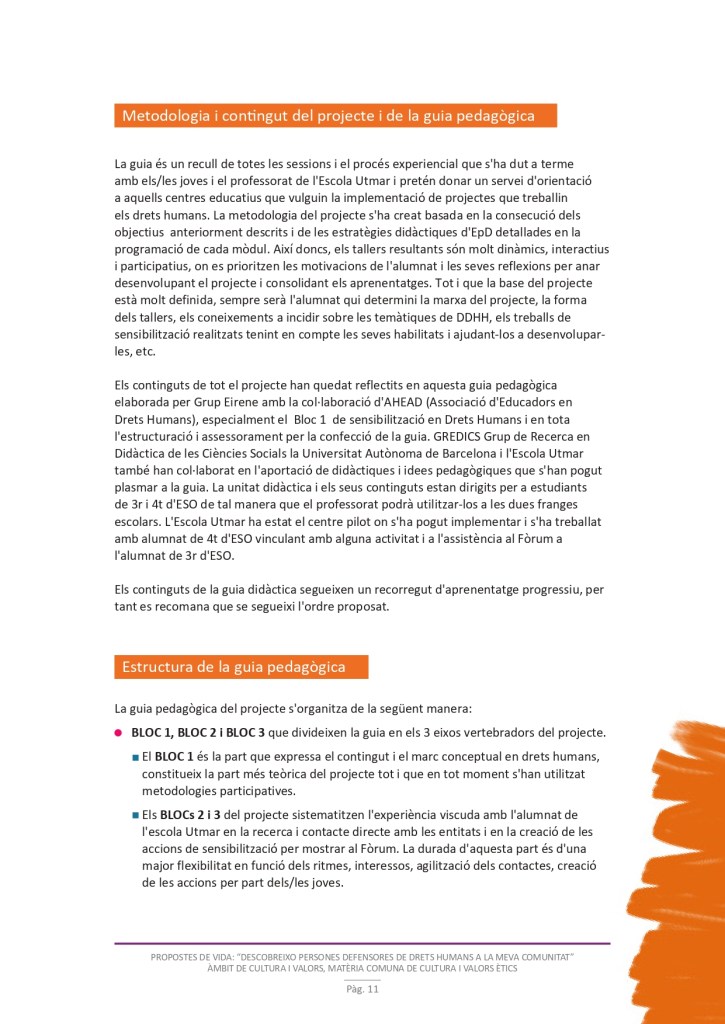 És un projecte d’aprenentatge i servei d’educació en drets humans que pretén endinsar als/les joves, d’una forma pràctica, en el coneixement i la importància de l’exercici d’aquests drets, així com en les accions que es generen per defensar-los en l’àmbit internacional i local. La intenció de tot aquest procés és la d’afavorir entre joves el coneixement social del seu entorn i del món per fomentar l’esperit crític i solidari que els impulsi a treballar i incorporar en la seva vida la consecució d’una vida digna per a tothom.