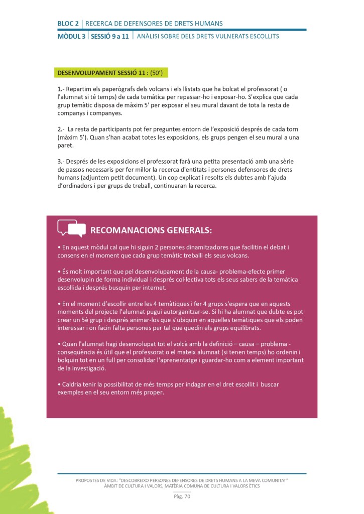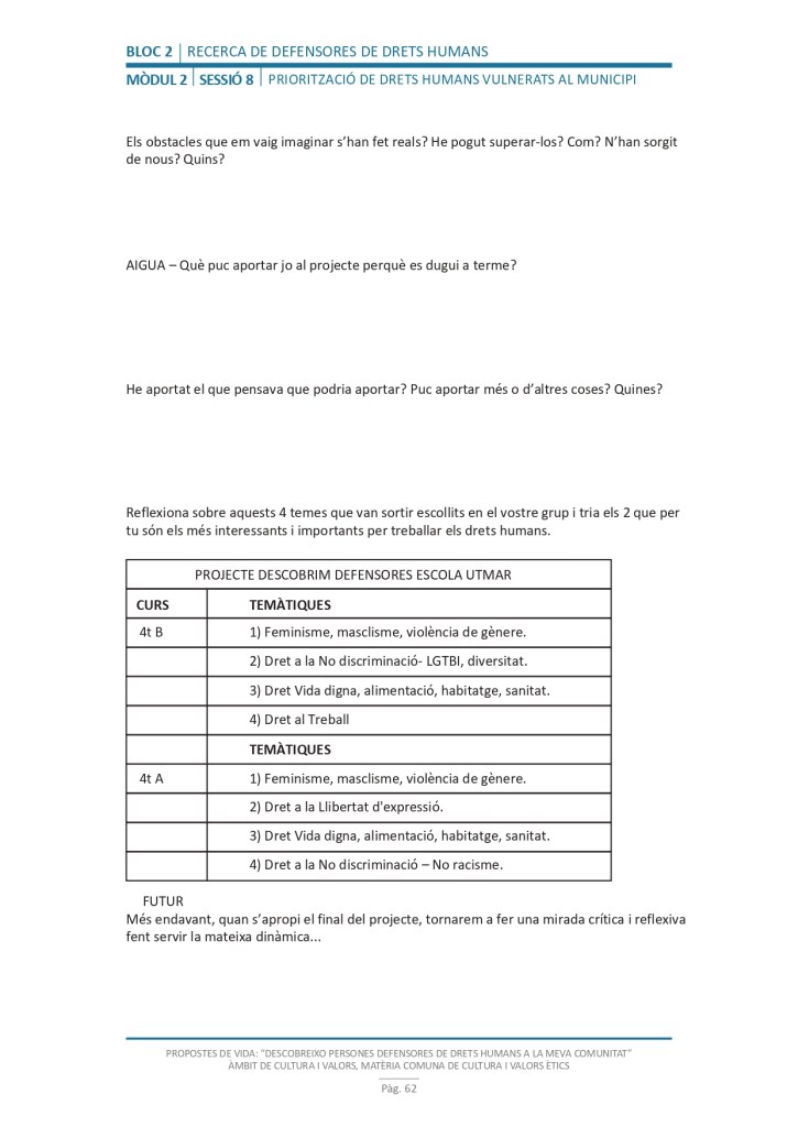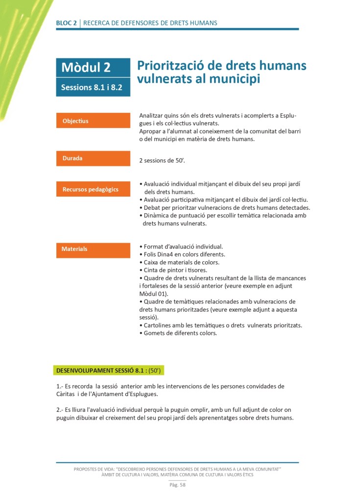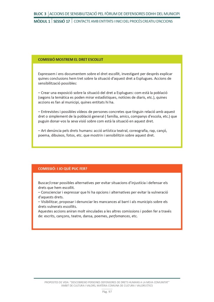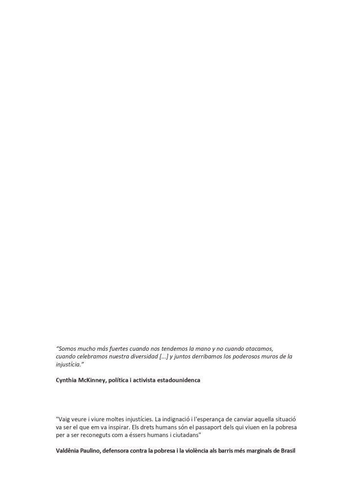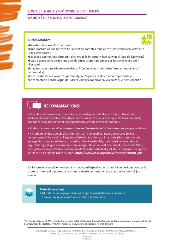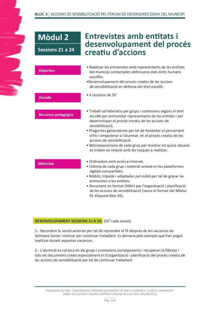 És un projecte d’aprenentatge i servei d’educació en drets humans que pretén endinsar als/les joves, d’una forma pràctica, en el coneixement i la importància de l’exercici d’aquests drets, així com en les accions que es generen per defensar-los en l’àmbit internacional i local. La intenció de tot aquest procés és la d’afavorir entre joves el coneixement social del seu entorn i del món per fomentar l’esperit crític i solidari que els impulsi a treballar i incorporar en la seva vida la consecució d’una vida digna per a tothom.