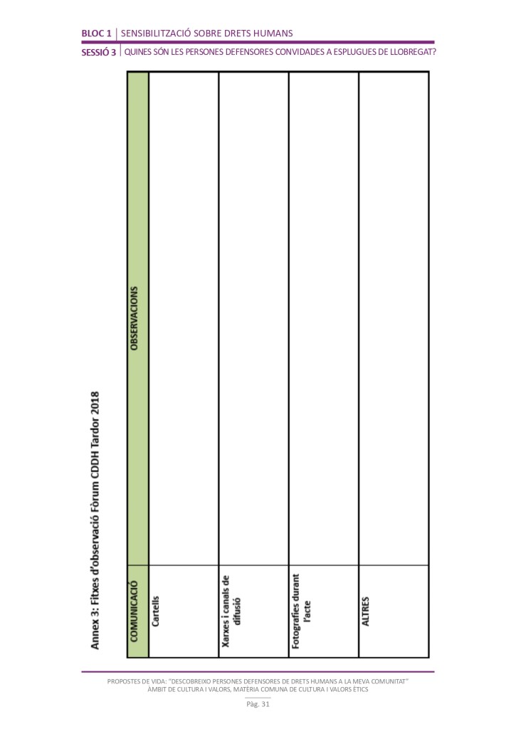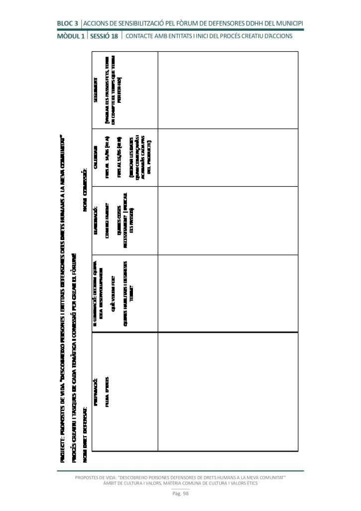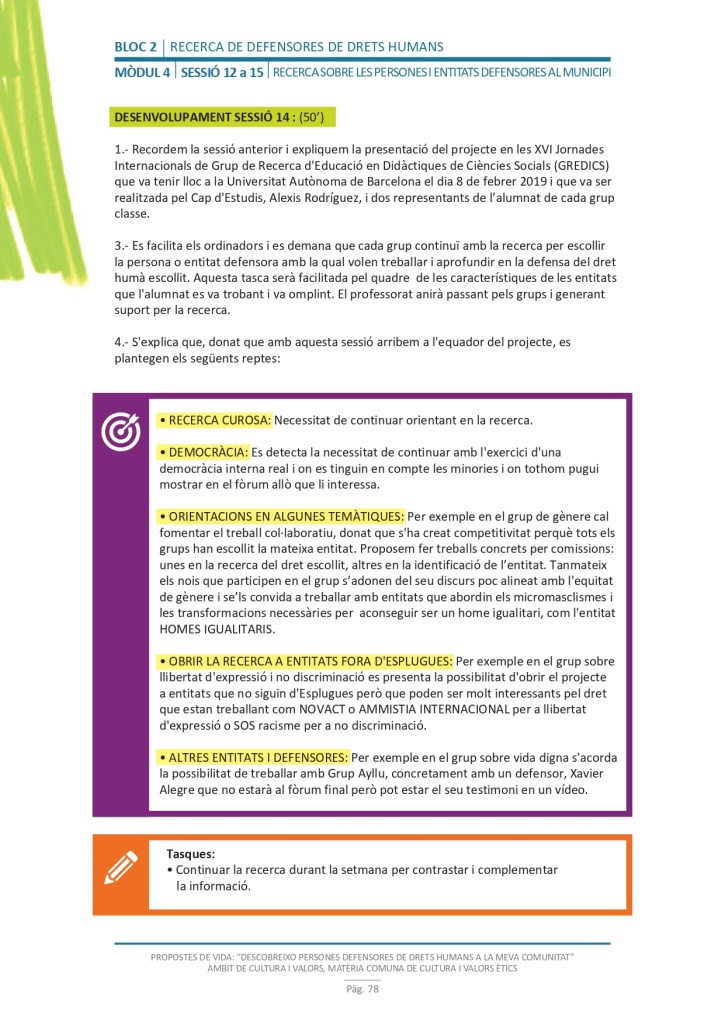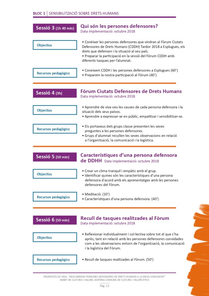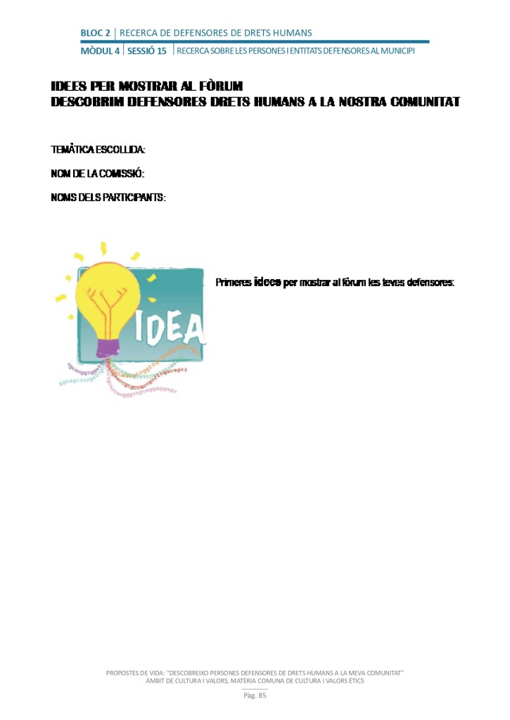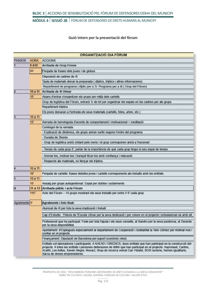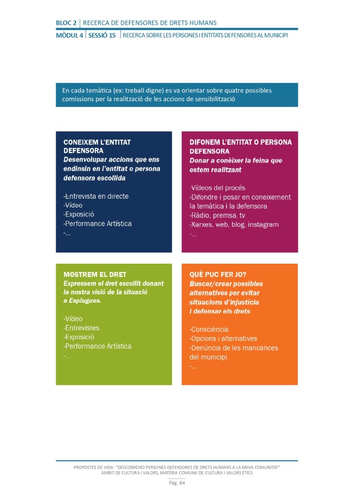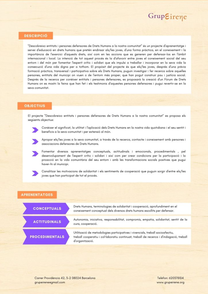 El propòsit del projecte és que els/les joves, després d’una prèvia formació pràctica, transversal participativa sobre els Drets Humans, puguin investigar i fer recerca sobre aquelles persones, entitats del municipi on viuen o de l’entorn més proper, que han pogut construir pau i justícia social. Després de la recerca per conèixer entitats i persones defensores, es proposarà la creació d’un Fòrum de DDHH on es mostri la feina que han fet i els testimonis d’aquestes persones defensores i pugui revertir-se en la seva comunitat.