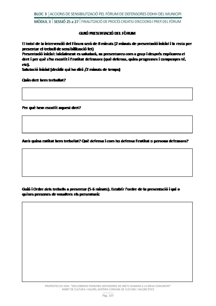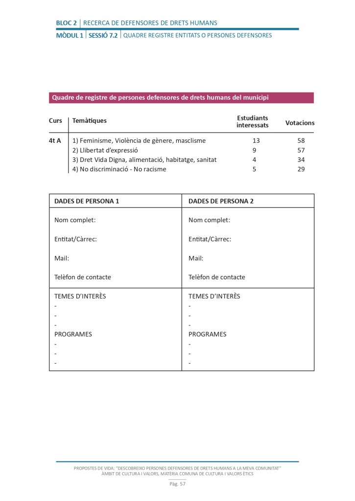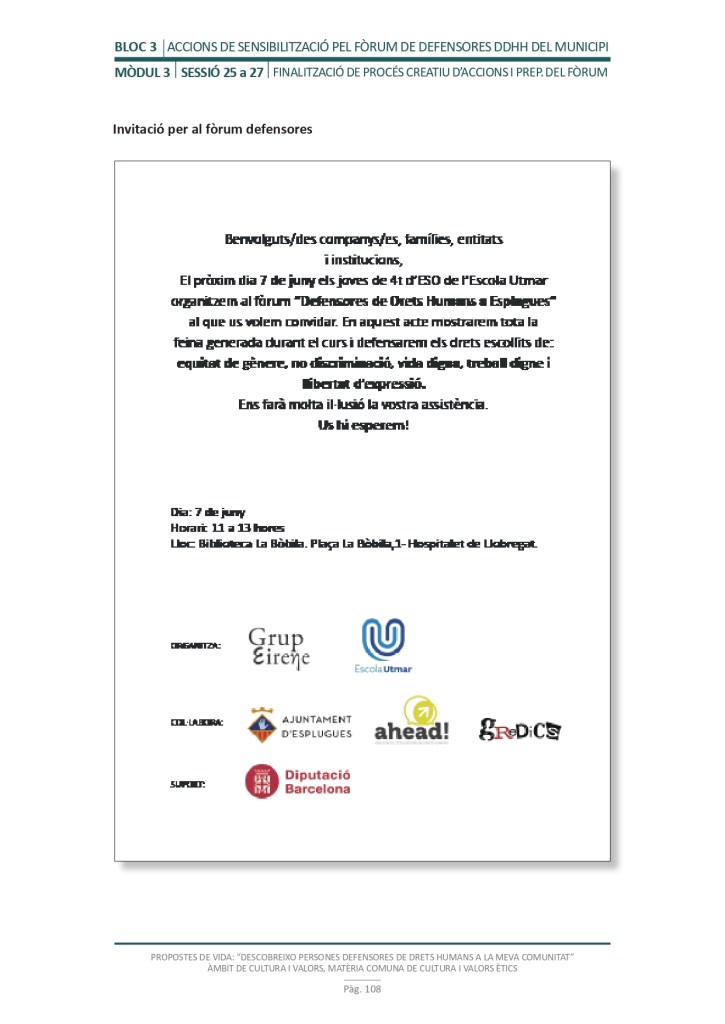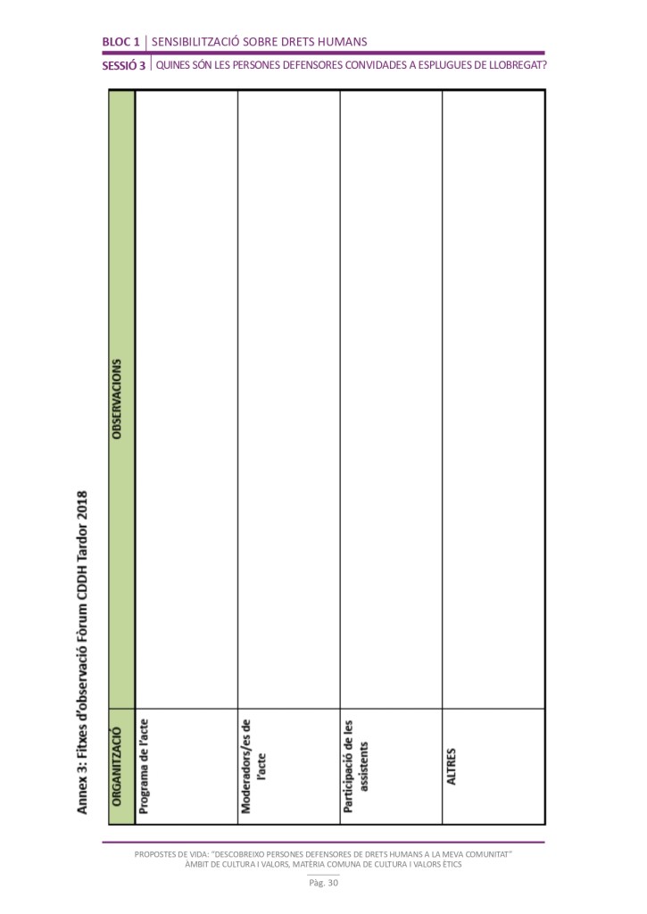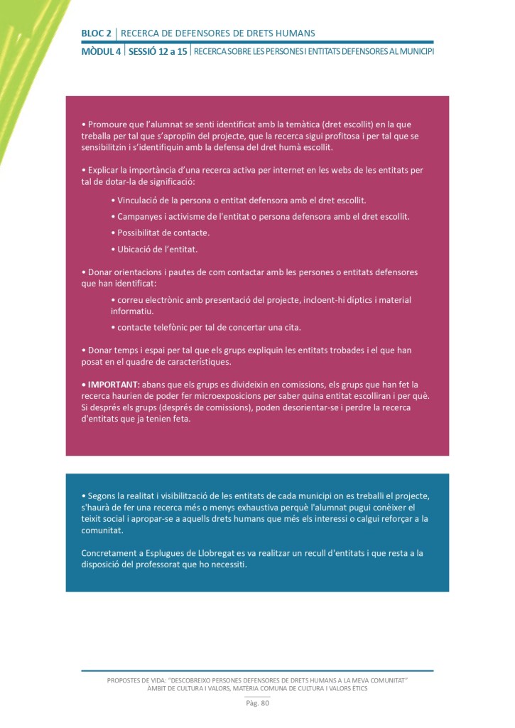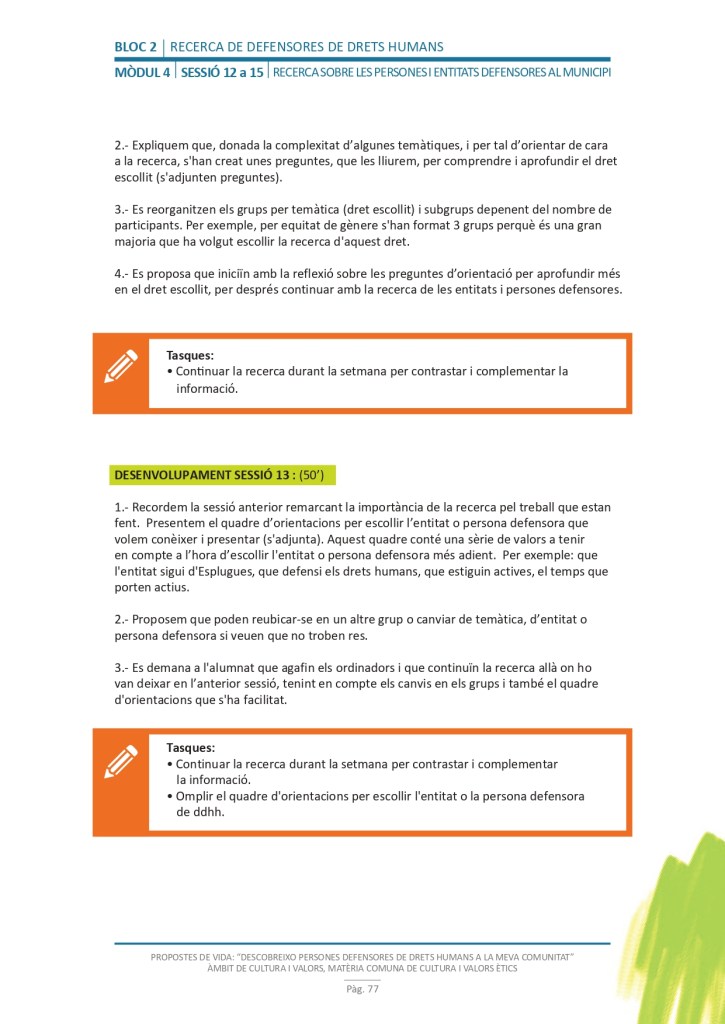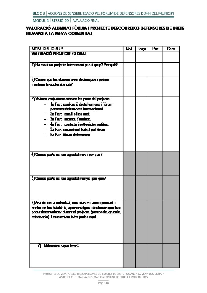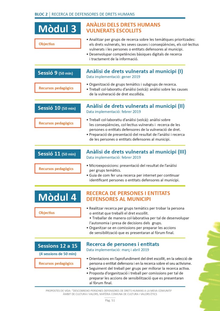 El propòsit del projecte és que els/les joves, després d’una prèvia formació pràctica, transversal participativa sobre els Drets Humans, puguin investigar i fer recerca sobre aquelles persones, entitats del municipi on viuen o de l’entorn més proper, que han pogut construir pau i justícia social. Després de la recerca per conèixer entitats i persones defensores, es proposarà la creació d’un Fòrum de DDHH on es mostri la feina que han fet i els testimonis d’aquestes persones defensores i pugui revertir-se en la seva comunitat.