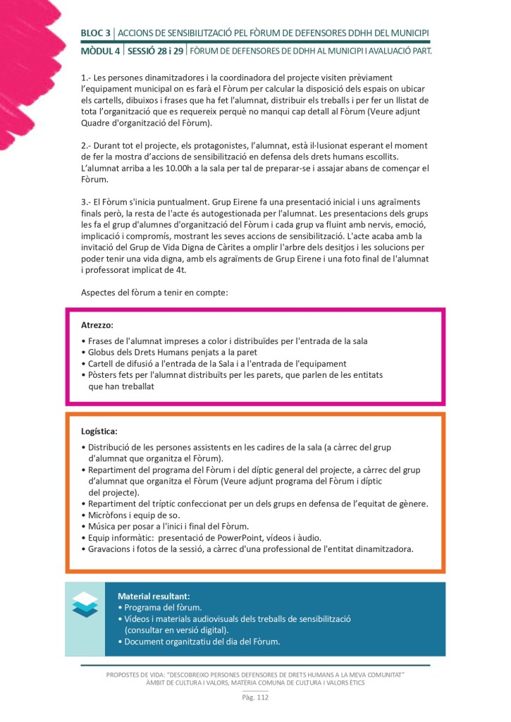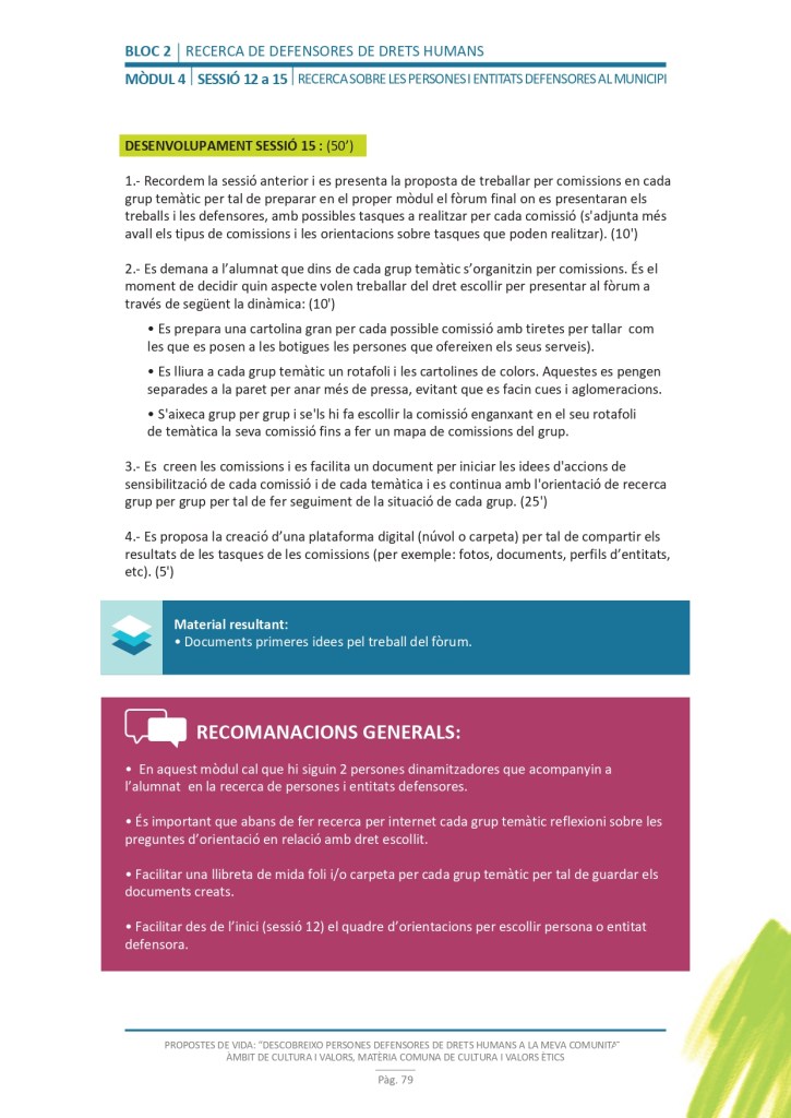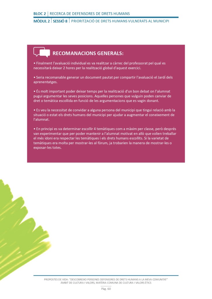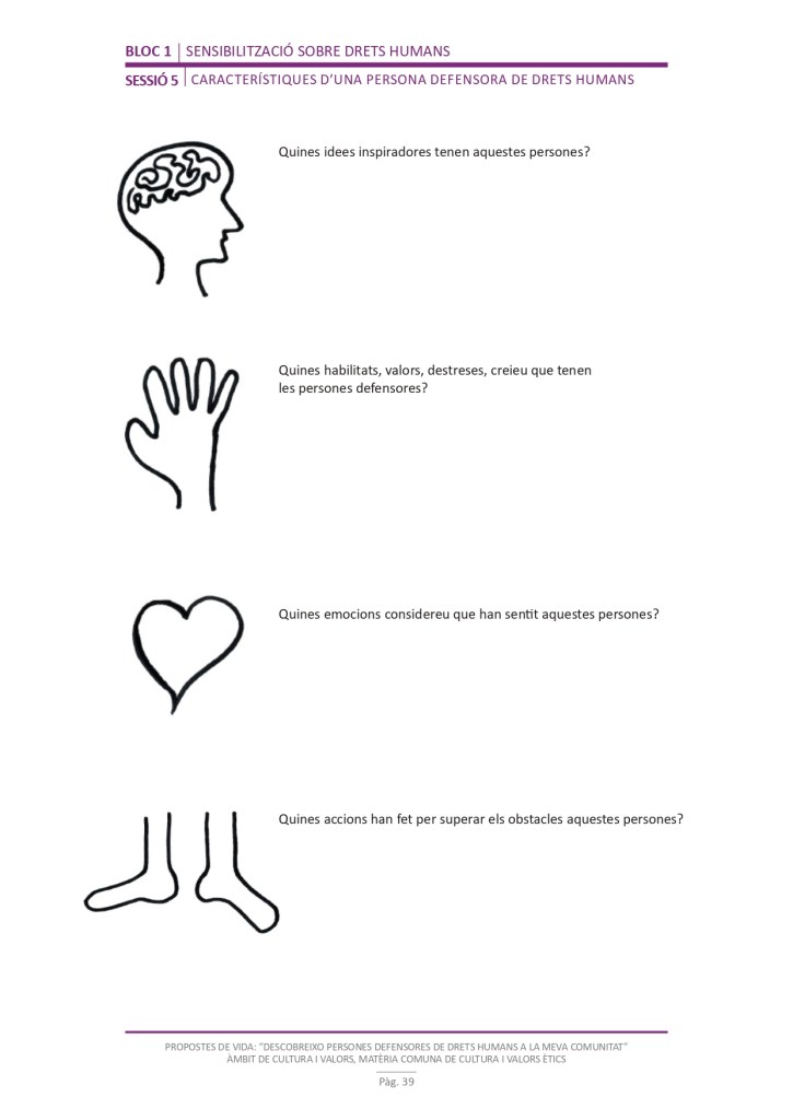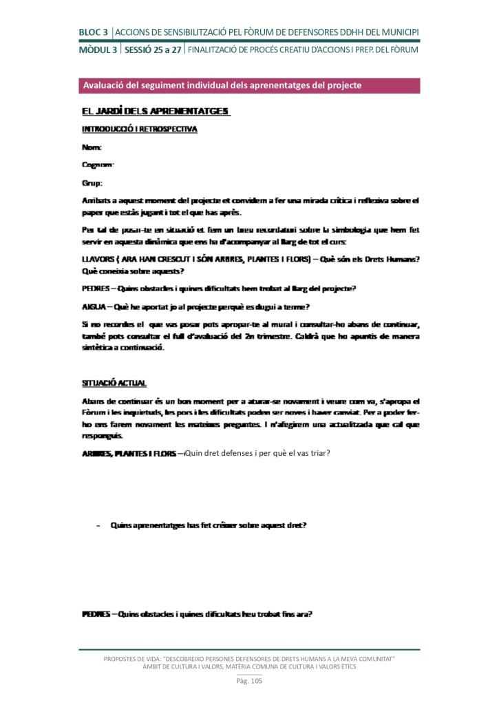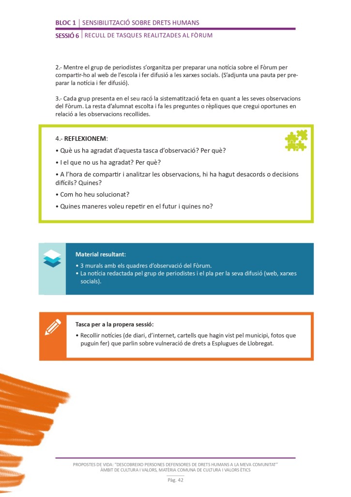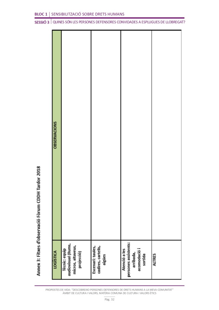 El propòsit del projecte és que els/les joves, després d’una prèvia formació pràctica, transversal participativa sobre els Drets Humans, puguin investigar i fer recerca sobre aquelles persones, entitats del municipi on viuen o de l’entorn més proper, que han pogut construir pau i justícia social. Després de la recerca per conèixer entitats i persones defensores, es proposarà la creació d’un Fòrum de DDHH on es mostri la feina que han fet i els testimonis d’aquestes persones defensores i pugui revertir-se en la seva comunitat.
