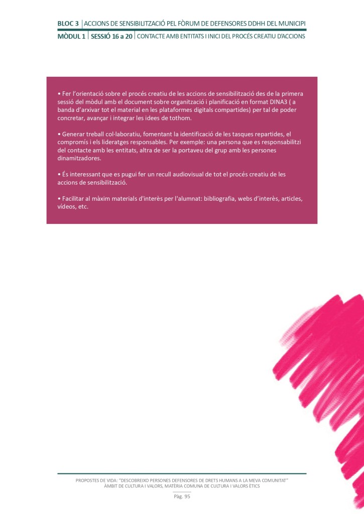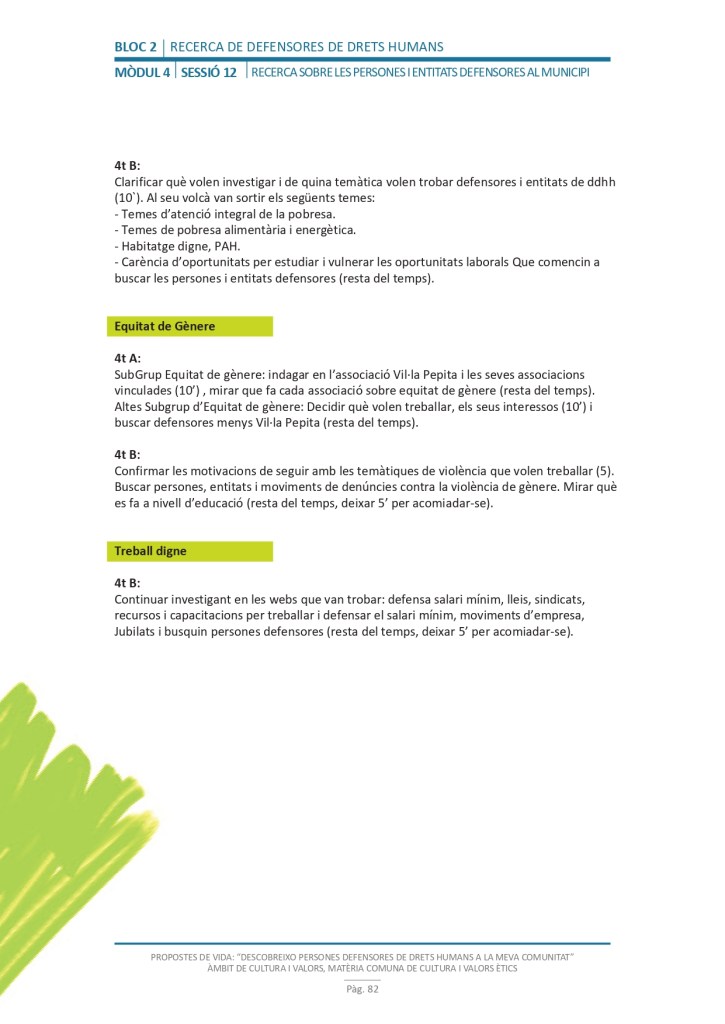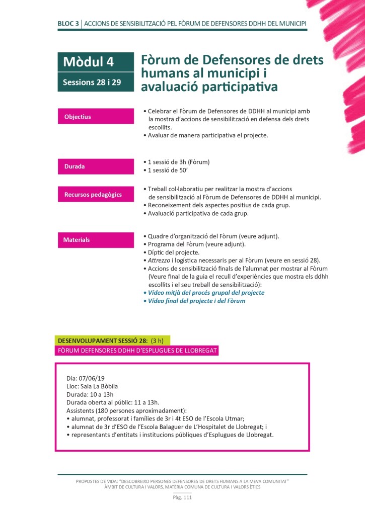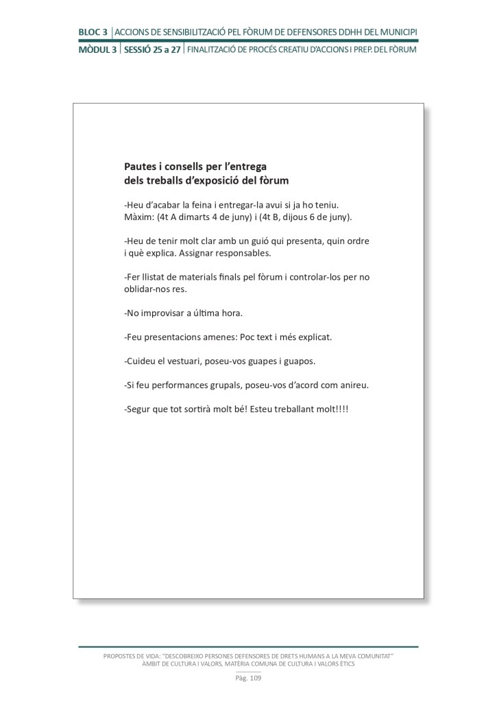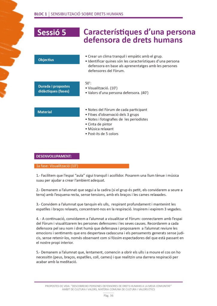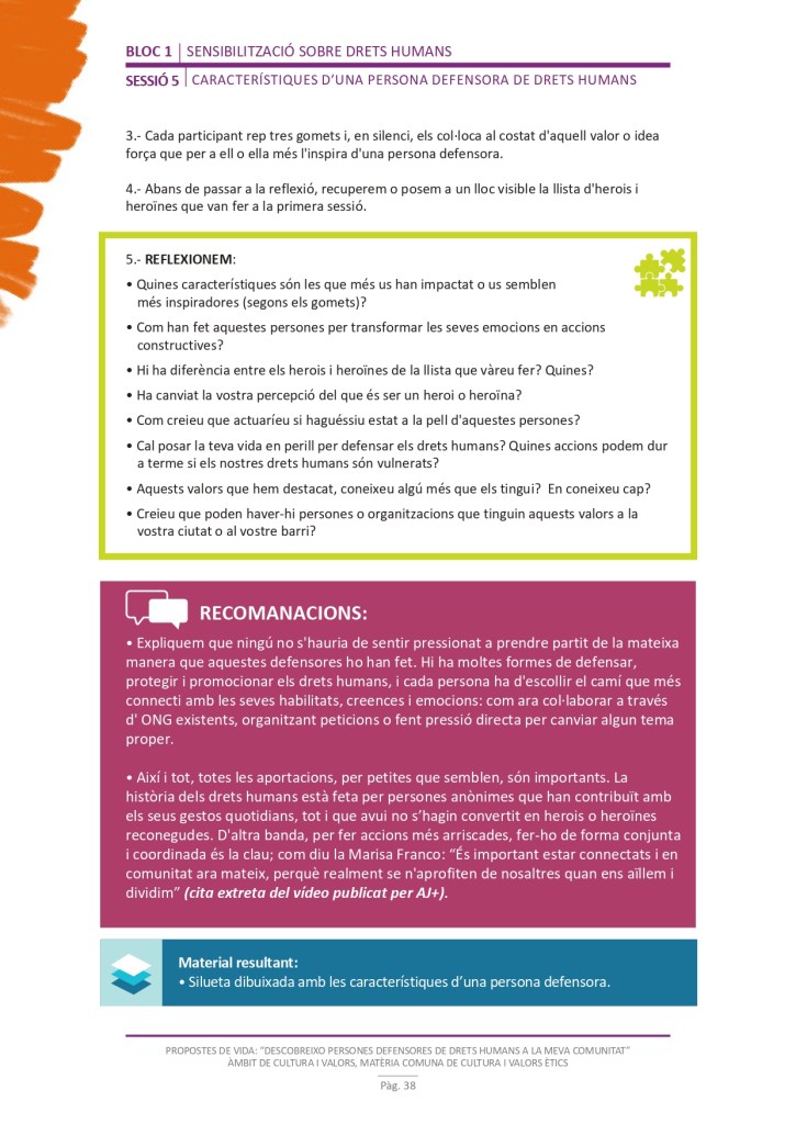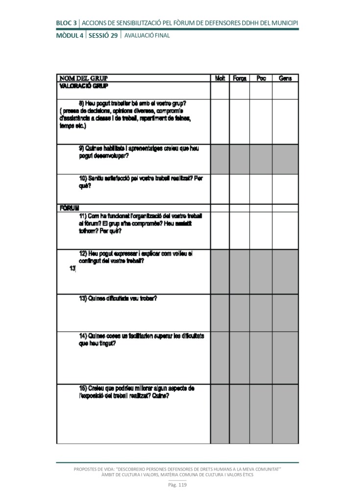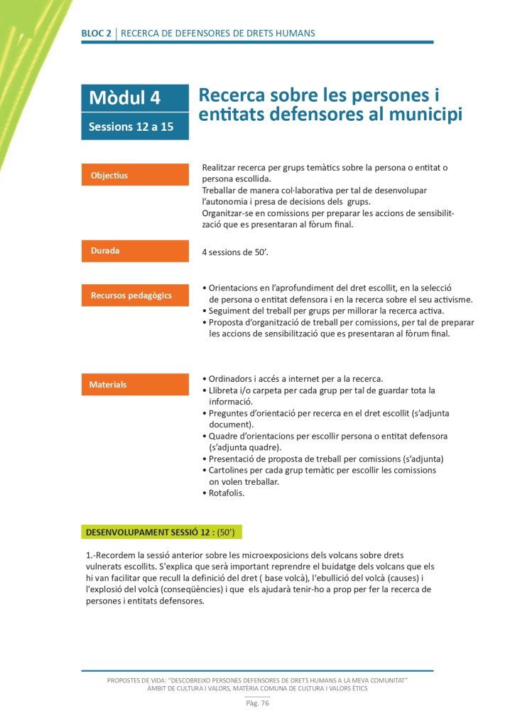 El propòsit del projecte és que els/les joves, després d’una prèvia formació pràctica, transversal participativa sobre els Drets Humans, puguin investigar i fer recerca sobre aquelles persones, entitats del municipi on viuen o de l’entorn més proper, que han pogut construir pau i justícia social. Després de la recerca per conèixer entitats i persones defensores, es proposarà la creació d’un Fòrum de DDHH on es mostri la feina que han fet i els testimonis d’aquestes persones defensores i pugui revertir-se en la seva comunitat.