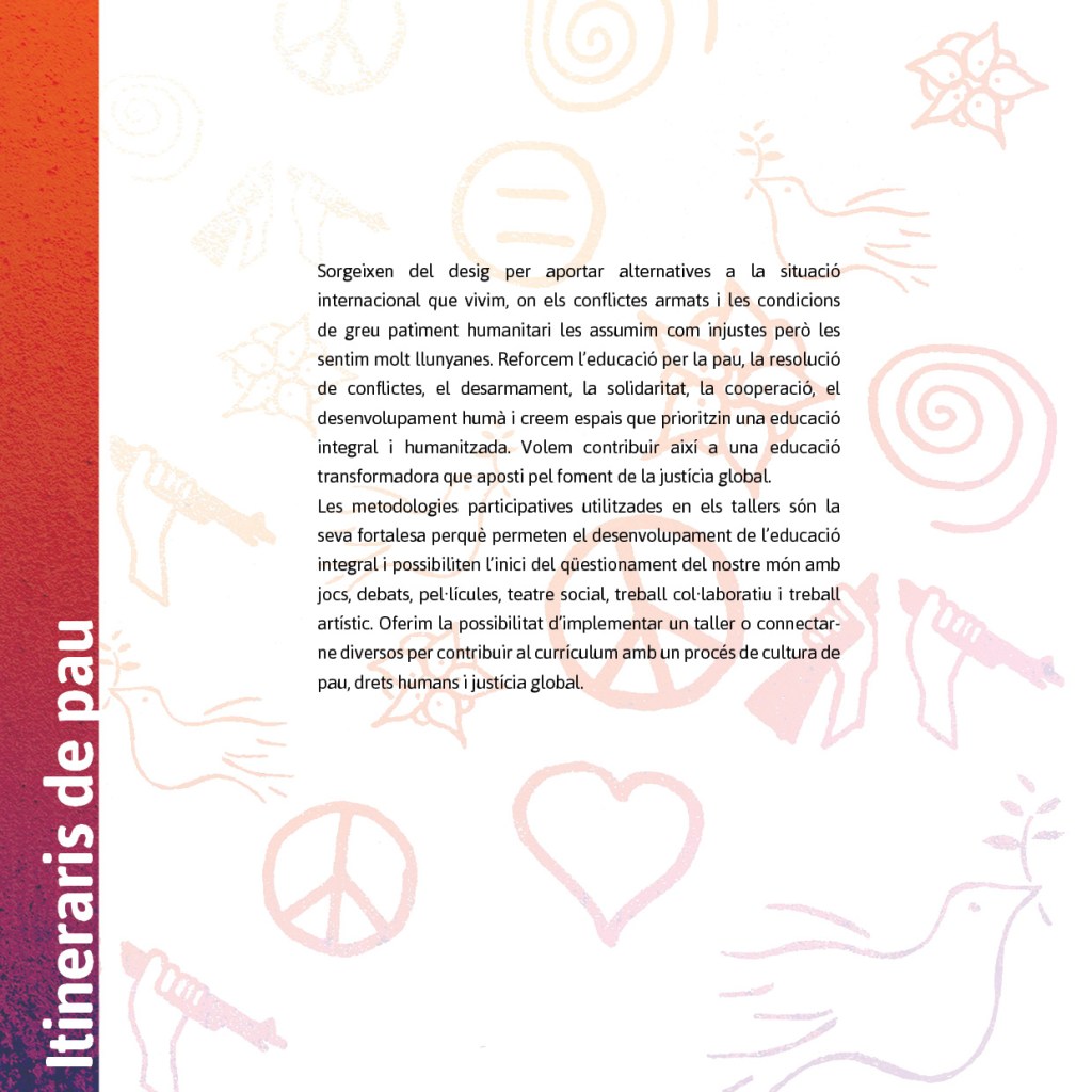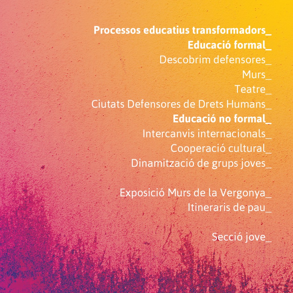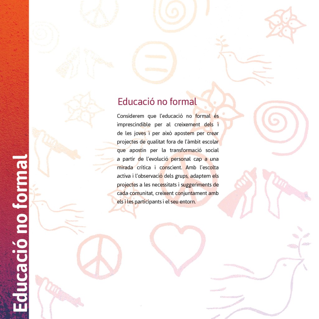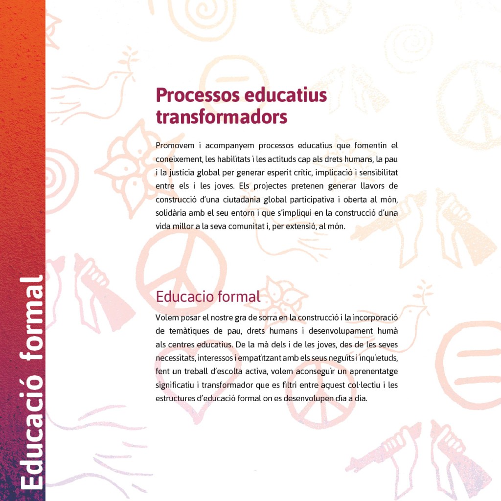 La nostra actuació vol impulsar l’educació, la formació i la capacitació professional en la noviolència a través del foment de la cultura de pau, el desenvolupament i la promoció dels drets humans entre els infants, els joves i els adults.