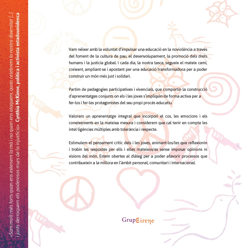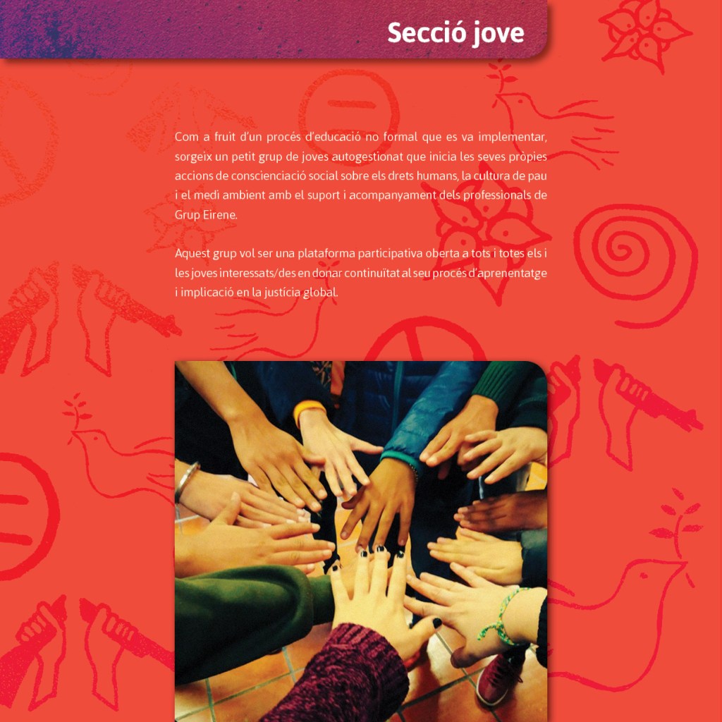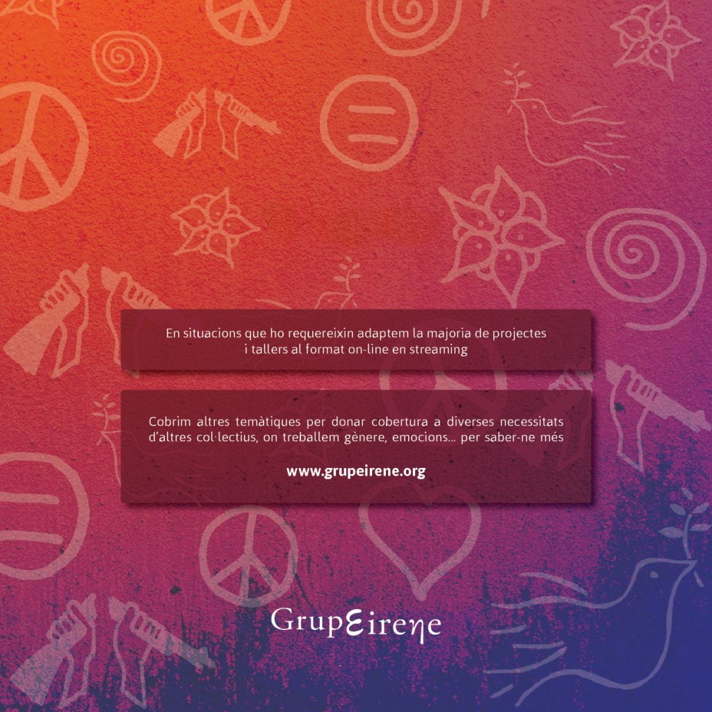 Grup Eirene neix el 17 d’octubre de 2011 amb la voluntat de crear una associació pacifista, educativa i solidària que promogui el respecte als drets humans des d’una perspectiva creativa i innovadora.