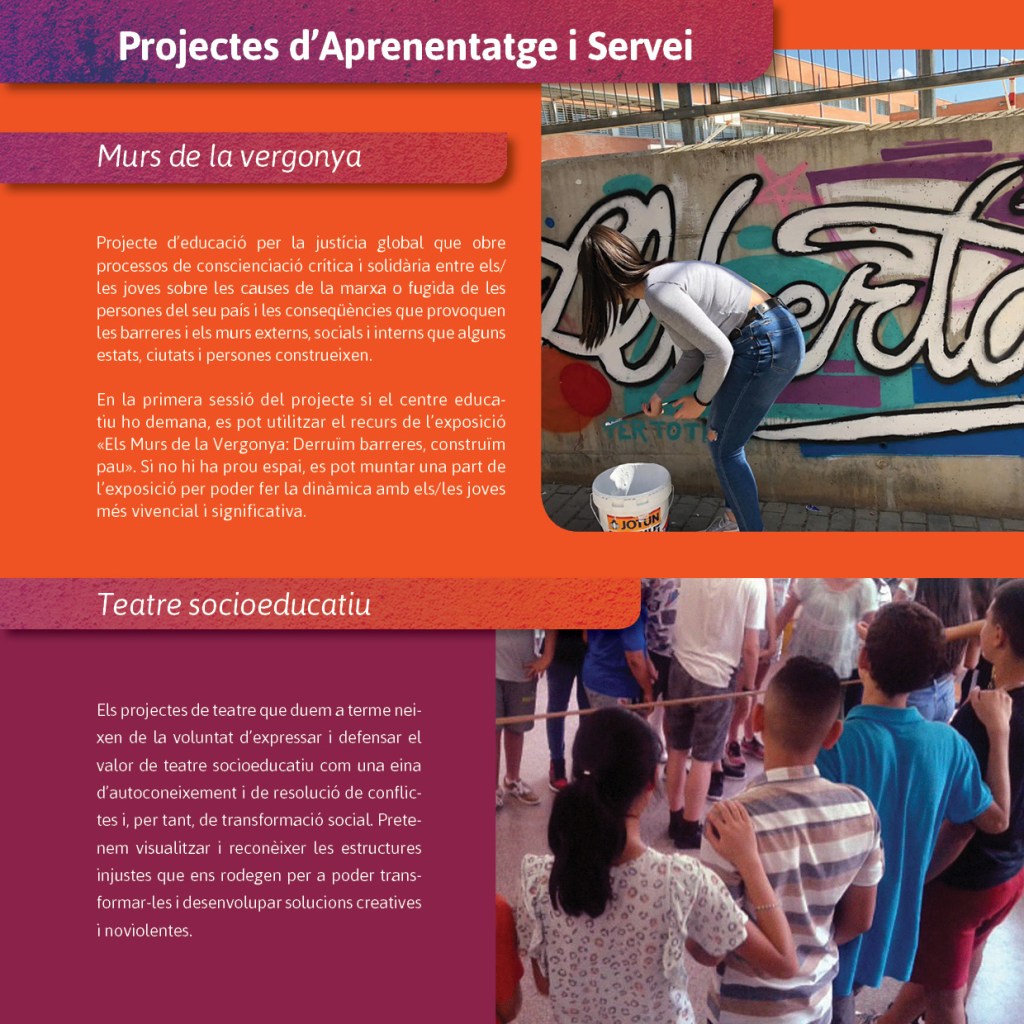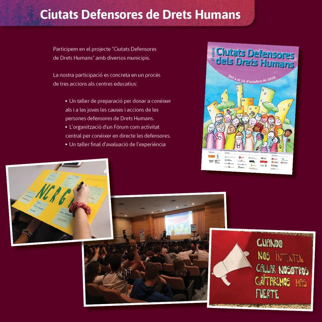 Les activitats que es realitzen busquen promoure l’educació en valors, la formació i la sensibilització de la població a través de processos d’aprenentatge que pretenen no només una actuació puntual sinó la implicació en un conjunt de fases o etapes que potenciïn la visió de la diversitat de la realitat com a punt de partida per fomentar l’esperit i el pensament crític i solidari.